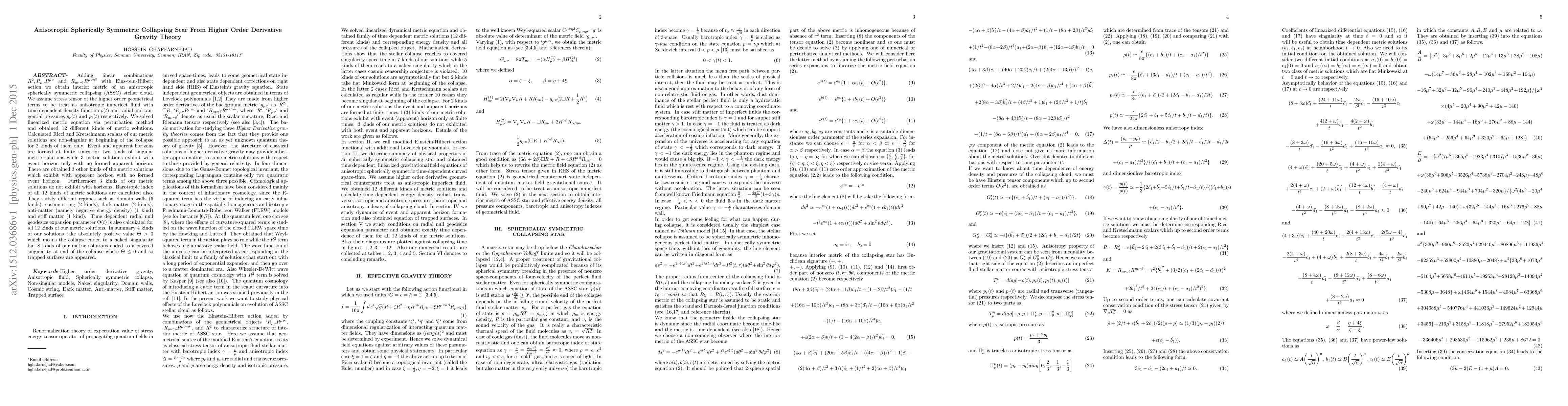 Adding linear combinations $R^2,R_{\mu\nu}R^{\mu\nu}$ and $R_{\mu\nu\eta\delta}R^{\mu\nu\eta\delta}$ with Einstein-Hilbert action we obtain interior metric of an an-isotropic spherically symmetric collapsing (ASSC) stellar cloud. We assume stress tensor of the higher order geometrical terms to be treat as an-isotropic imperfect fluid with time dependent density function $\rho(t)$ and radial and tangential pressures $p_r(t)$ and $p_t(t)$ respectively. We solved linearized metric equation via perturbation method and obtained 12 different kinds of metric solutions. Calculated Ricci and Kretschmann scalars of our metric solutions are non-singular at beginning of the collapse for 2 kinds of them only. Event and apparent horizons are formed at finite times for two kinds of singular metric solutions while 3 metric solutions exhibit with event horizon only with no formed apparent horizon. There are obtained 3 other kinds of the metric solutions which exhibit with apparent horizon with no formed event horizon. Furthermore 3 kinds of our metric solutions do not exhibit with horizons. Barotropic index of all 12 kinds of metric solutions are calculated also. They satisfy different regimes such as domain walls (6 kinds), cosmic string (2 kinds), dark matter (2 kinds), anti-matter (namely negative energy density) (1 kind) and stiff matter (1 kind). Time dependent radial null geodesics expansion parameter $\Theta(t)$ is also calculated for all 12 kinds of our metric solutions. In summary 4 kinds of our solutions take absolutely positive value $\Theta>0$ which means the collapse ended to a naked singularity but 8 kinds of our metric solutions ended to a covered singularity at end of the collapse where $\Theta\leq0$ and so trapped surfaces are appeared.