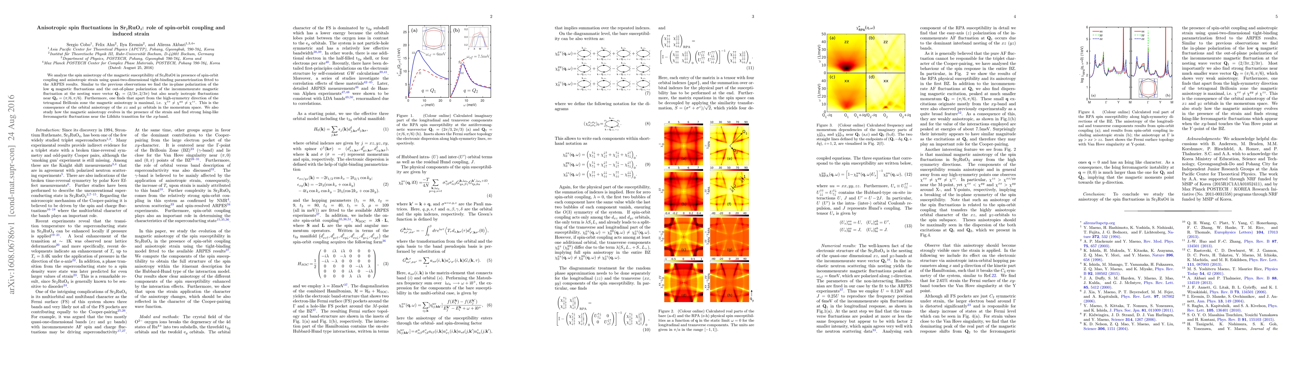 We analyze the spin anisotropy of the magnetic susceptibility of Sr$_2$RuO$4$ in presence of spin-orbit coupling and anisotropic strain using quasi-two-dimensional tight-binding parametrization fitted to the ARPES results. Similar to the previous observations we find the in-plane polarization of the low ${\bf q}$ magnetic fluctuations and the out-of-plane polarization of the incommensurate magnetic fluctuation at the nesting wave vector ${\bf Q}_1 = (2/3 \pi ,2/3 \pi)$ but also nearly isotropic fluctuations near ${\bf Q}_2=(\pi/6,\pi/6)$. Furthermore, one finds that apart from the high-symmetry direction of the tetragonal Brillouin zone the magnetic anisotropy is maximal, i.e. $\chi^{xx} \neq \chi^{yy} \neq \chi^{zz}$. This is the consequence of the orbital anisotropy of the $xz$ and $yz$ orbitals in the momentum space. We also study how the magnetic anisotropy evolves in the presence of the strain and find strong Ising-like ferromagnetic fluctuations near the Lifshitz transition for the $xy$-band.