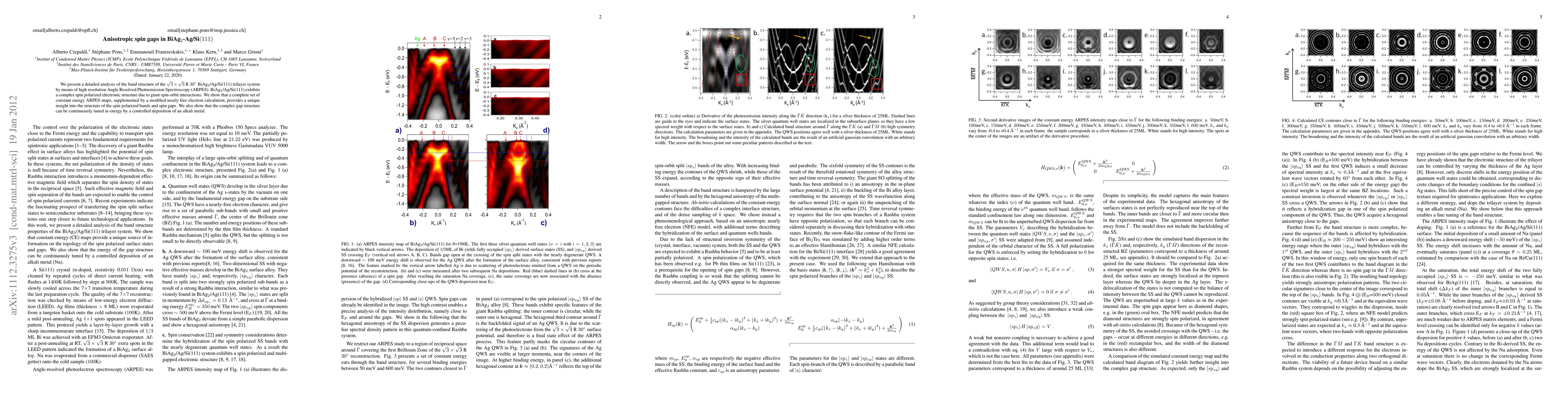 Title: Anisotropic spin gaps in BiAg$_2$-Ag/Si(111) Summary: High resolution ARPES reveals complex, tunable spin-polarized electronic structures in BiAg$_2$/Ag/Si(111) due to strong spin-orbit interactions, with spin gaps varying with alkali metal deposition.
