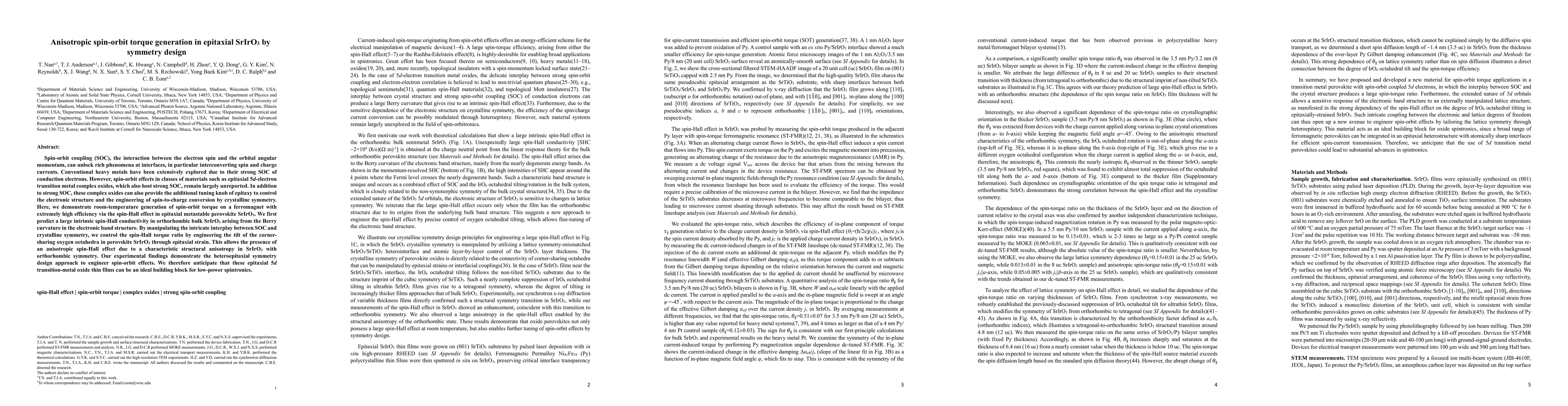 Spin-orbit coupling (SOC), the interaction between the electron spin and the orbital angular momentum, can unlock rich phenomena at interfaces, in particular interconverting spin and charge currents. Conventional heavy metals have been extensively explored due to their strong SOC of conduction electrons. However, spin-orbit effects in classes of materials such as epitaxial 5d-electron transition metal complex oxides, which also host strong SOC, remain largely unreported. In addition to strong SOC, these complex oxides can also provide the additional tuning knob of epitaxy to control the electronic structure and the engineering of spin-to-charge conversion by crystalline symmetry. Here, we demonstrate room-temperature generation of spin-orbit torque on a ferromagnet with extremely high efficiency via the spin-Hall effect in epitaxial metastable perovskite SrIrO3. We first predict a large intrinsic spin-Hall conductivity in orthorhombic bulk SrIrO3 arising from the Berry curvature in the electronic band structure. By manipulating the intricate interplay between SOC and crystalline symmetry, we control the spin-Hall torque ratio by engineering the tilt of the corner-sharing oxygen octahedra in perovskite SrIrO3 through epitaxial strain. This allows the presence of an anisotropic spin-Hall effect due to a characteristic structural anisotropy in SrIrO3 with orthorhombic symmetry. Our experimental findings demonstrate the heteroepitaxial symmetry design approach to engineer spin-orbit effects. We therefore anticipate that these epitaxial 5d transition-metal oxide thin films can be an ideal building block for low-power spintronics.