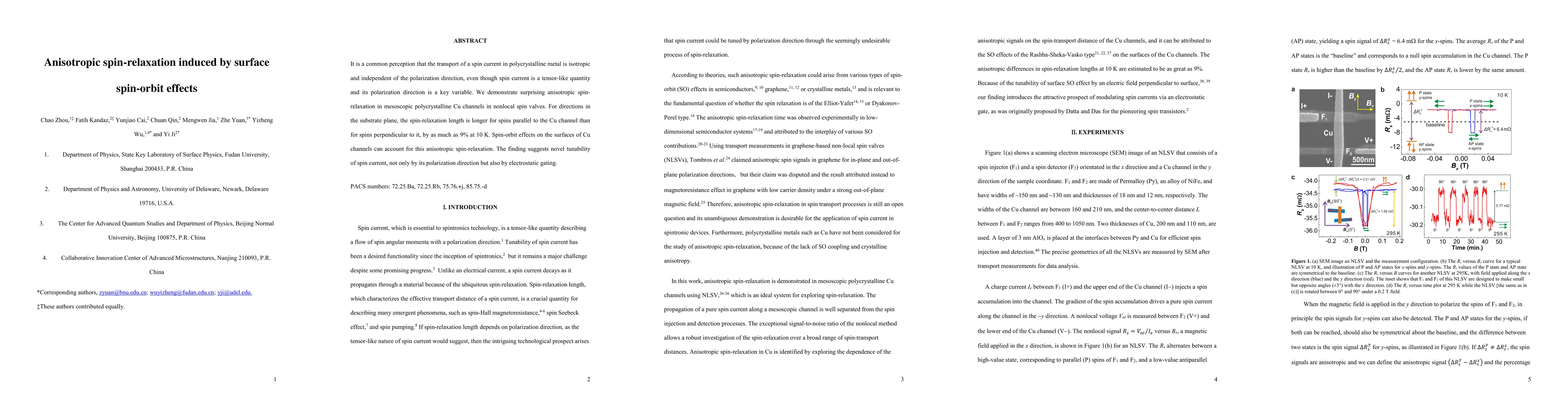 This work presents a novel understanding of anisotropic spin-relaxation in Cu channels, with implications for spintronics device design.