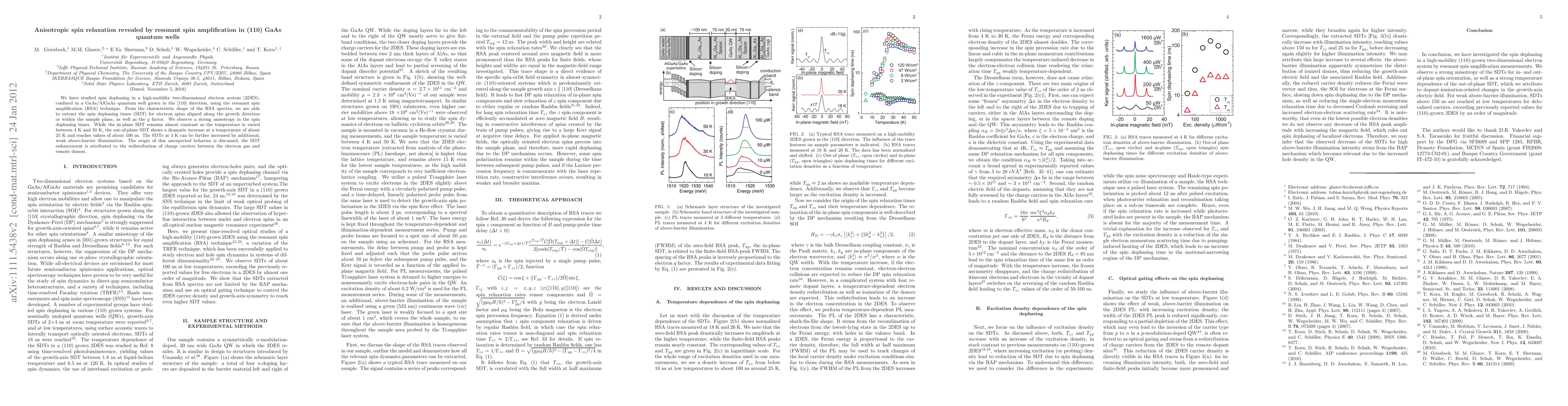 This study reveals anisotropic spin relaxation in (110) GaAs quantum wells using resonant spin amplification, showing a significant difference in spin dephasing times between in-plane and out-of-plane directions, with the out-of-plane time dramatically increasing at 25 K. The enhancement is attributed to charge redistribution between the electron gas and remote donors.