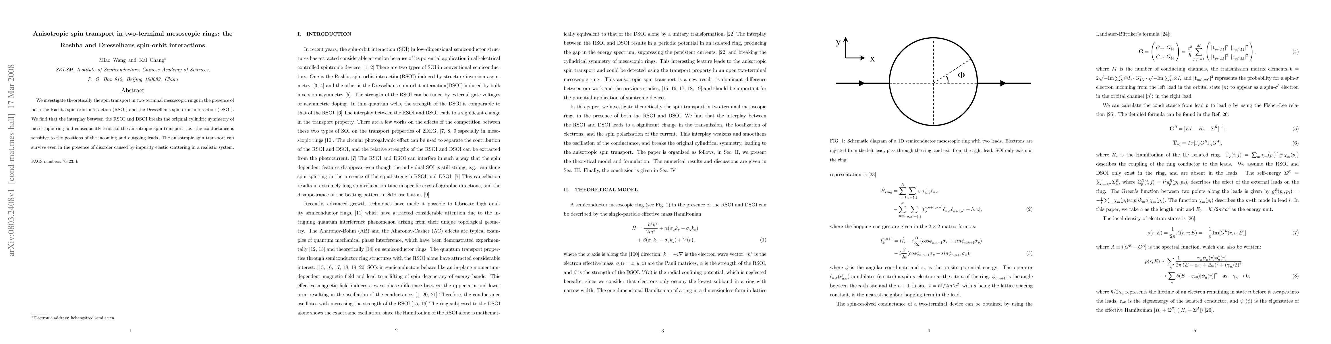 This paper theoretically explores the anisotropic spin transport in two-terminal mesoscopic rings influenced by both Rashba and Dresselhaus spin-orbit interactions. The study reveals that these interactions disrupt the ring's cylindrical symmetry, resulting in position-dependent conductance, which persists even amid disorder from impurity scattering.