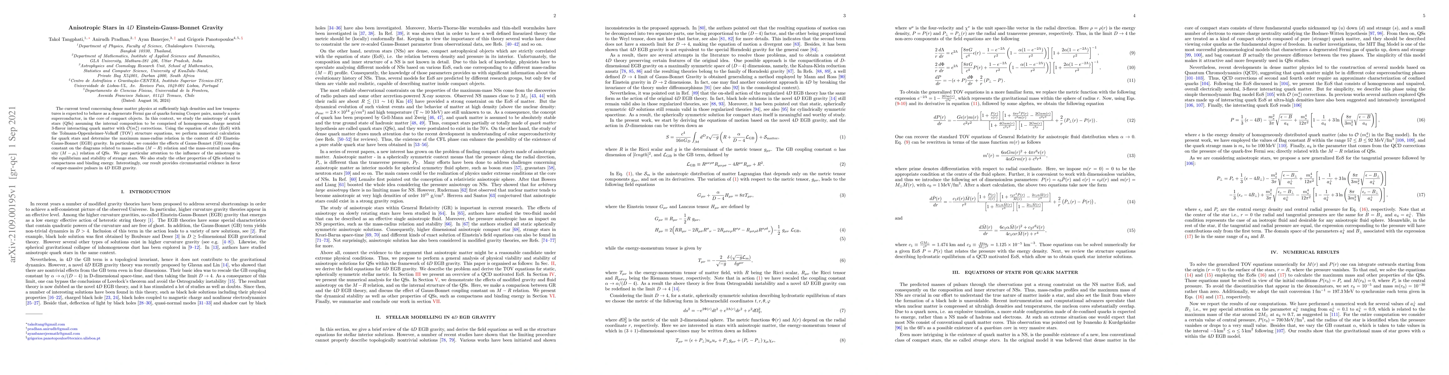 This paper investigates the anisotropy of quark stars in the framework of 4D Einstein-Gauss-Bonnet gravity, focusing on the mass-radius and mass-central density relations. It finds that the Gauss-Bonnet coupling constant influences the stability and properties of these stars, potentially supporting the existence of super-massive pulsars.