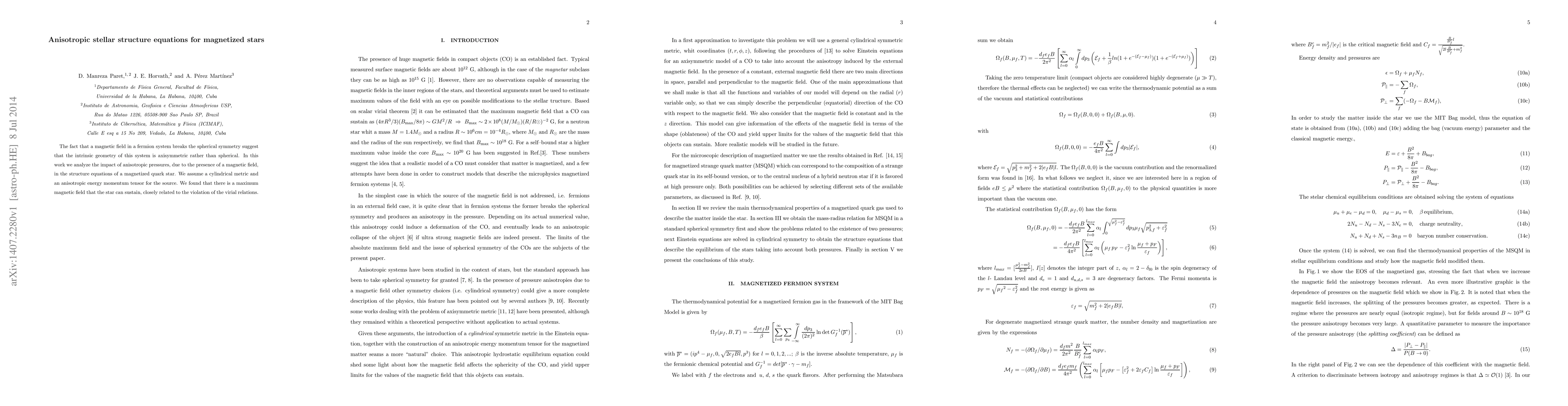 The fact that a magnetic field in a fermion system breaks the spherical symmetry suggest that the intrinsic geometry of this system is axisymmetric rather than spherical. In this work we analyze the impact of anisotropic pressures, due to the presence of a magnetic field, in the structure equations of a magnetized quark star. We assume a cylindrical metric and an anisotropic energy momentum tensor for the source. We found that there is a maximum magnetic field that the star can sustain, closely related to the violation of the virial relations.
