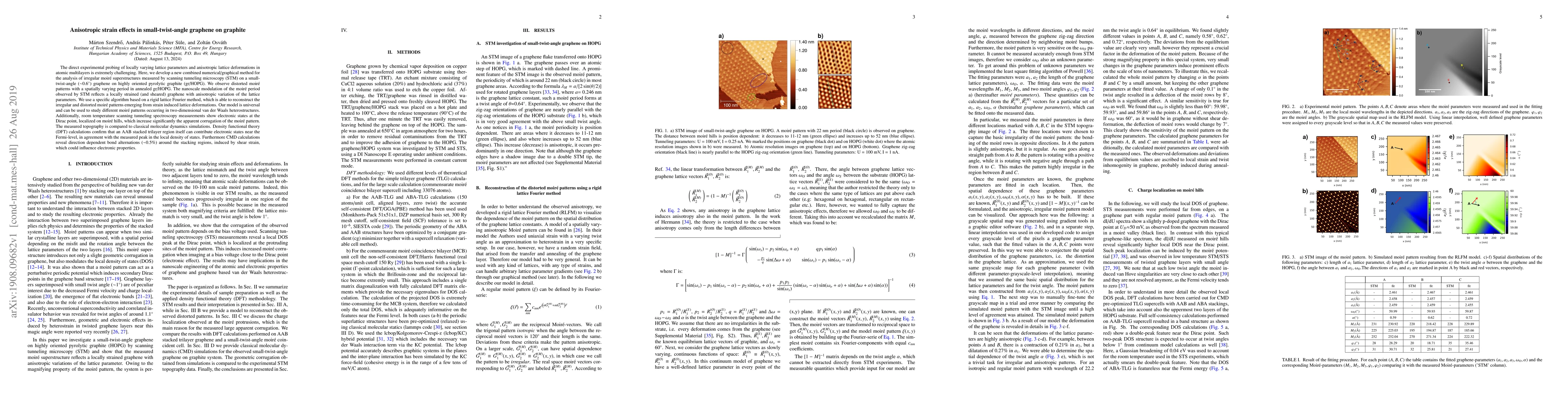 This paper develops a new method to analyze anisotropic strain effects in small-twist-angle graphene on graphite using scanning tunneling microscopy and numerical reconstruction. The study reveals locally strained and sheared graphene with anisotropic lattice deformations, and identifies electronic states at the Dirac point influenced by the moiré pattern.