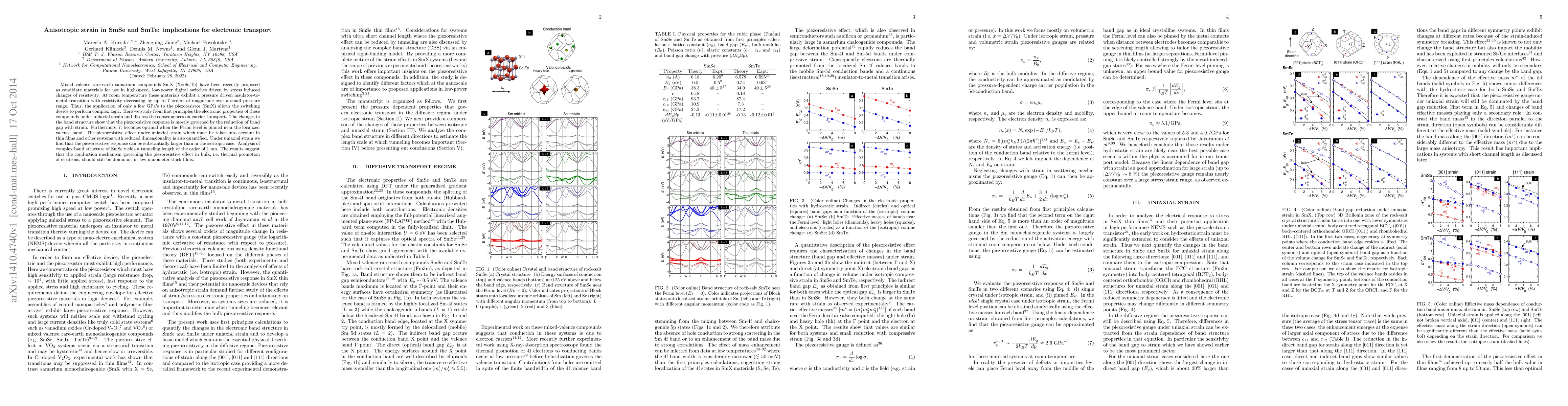 Mixed valence rare-earth samarium compounds SmX (X=Se,Te) have been recently proposed as candidate materials for use in high-speed, low-power digital switches driven by stress induced changes of resistivity. At room temperature these materials exhibit a pressure driven insulator-to-metal transition with resistivity decreasing by up to 7 orders of magnitude over a small pressure range. Thus, the application of only a few GPa's to the piezoresistor (SmX) allows the switching device to perform complex logic. Here we study from first principles the electronic properties of these compounds under uniaxial strain and discuss the consequences on carrier transport. The changes in the band structure show that the piezoresistive response is mostly governed by the reduction of band gap with strain. Furthermore, it becomes optimal when the Fermi level is pinned near the localized valence band. The piezoresistive effect under uniaxial strain which must be taken into account in thin films and other systems with reduced dimensionality is also quantified. Under uniaxial strain we find that the piezoresistive response can be substantially larger than in the isotropic case. Analysis of complex band structure of SmSe yields a tunneling length of the order of 1 nm. The results suggest that the conduction mechanism governing the piezoresistive effect in bulk, i.e.~thermal promotion of electrons, should still be dominant in few-nanometer-thick films.