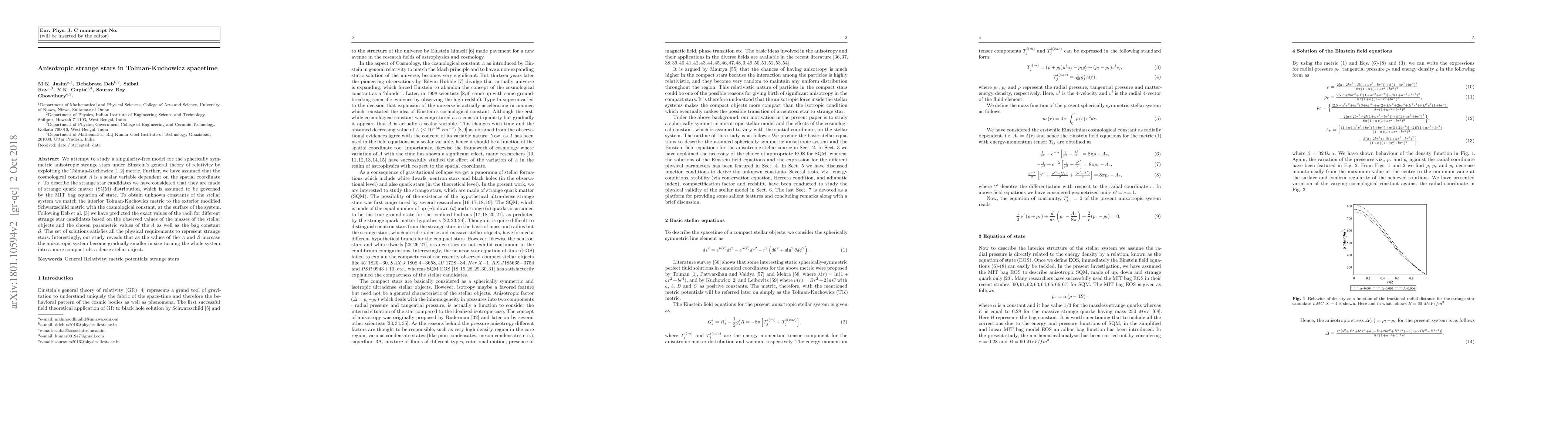 We attempt to study a singularity-free model for the spherically symmetric anisotropic strange stars under Einstein's general theory of relativity by exploiting the Tolman-Kuchowicz metric. Further, we have assumed that the cosmological constant $\Lambda$ is a scalar variable dependent on the spatial coordinate $r$. To describe the strange star candidates we have considered that they are made of strange quark matter (SQM) distribution, which is assumed to be governed by the MIT bag equation of state. To obtain unknown constants of the stellar system we match the interior Tolman-Kuchowicz metric to the exterior modified Schwarzschild metric with the cosmological constant, at the surface of the system. Following Deb et al. we have predicted the exact values of the radii for different strange star candidates based on the observed values of the masses of the stellar objects and the chosen parametric values of the $\Lambda$ as well as the bag constant $\mathcal{B}$. The set of solutions satisfies all the physical requirements to represent strange stars. Interestingly, our study reveals that as the values of the $\Lambda$ and $\mathcal{B}$ increase the anisotropic system becomes gradually smaller in size turning the whole system into a more compact ultra-dense stellar object.