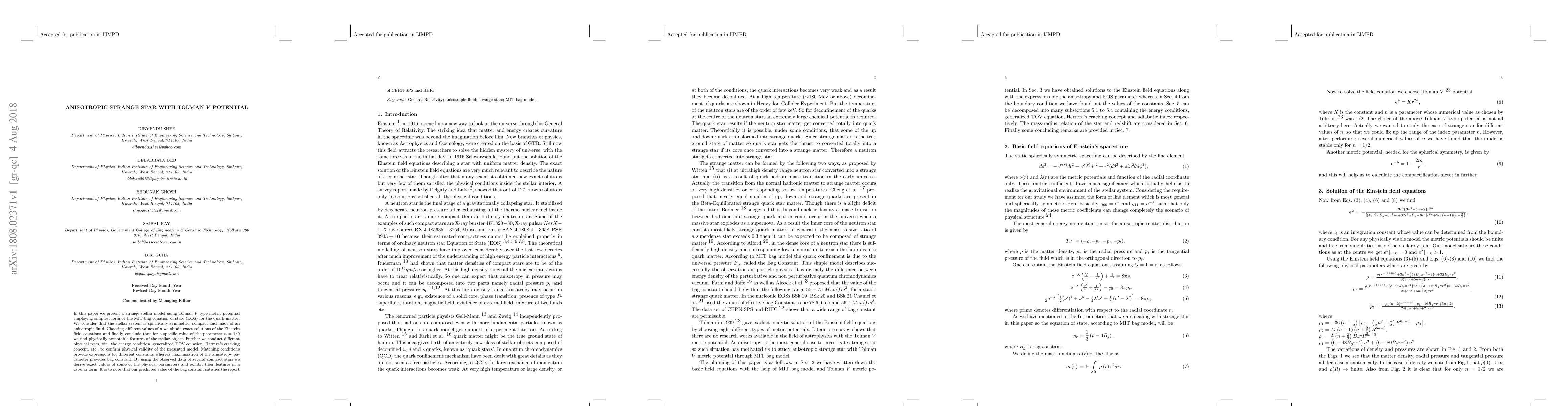 In this paper we present a strange stellar model using Tolman $V$ type metric potential employing simplest form of the MIT bag equation of state (EOS) for the quark matter. We consider that the stellar system is spherically symmetric, compact and made of an anisotropic fluid. Choosing different values of $n$ we obtain exact solutions of the Einstein field equations and finally conclude that for a specific value of the parameter $n=1/2$ we find physically acceptable features of the stellar object. Further we conduct different physical tests, viz., the energy condition, generalized TOV equation, Herrera's cracking concept, etc., to confirm physical validity of the presented model. Matching conditions provide expressions for different constants whereas maximization of the anisotropy parameter provides bag constant. By using the observed data of several compact stars we derive exact values of some of the physical parameters and exhibit their features in a tabular form. It is to note that our predicted value of the bag constant satisfies the report of CERN-SPS and RHIC.