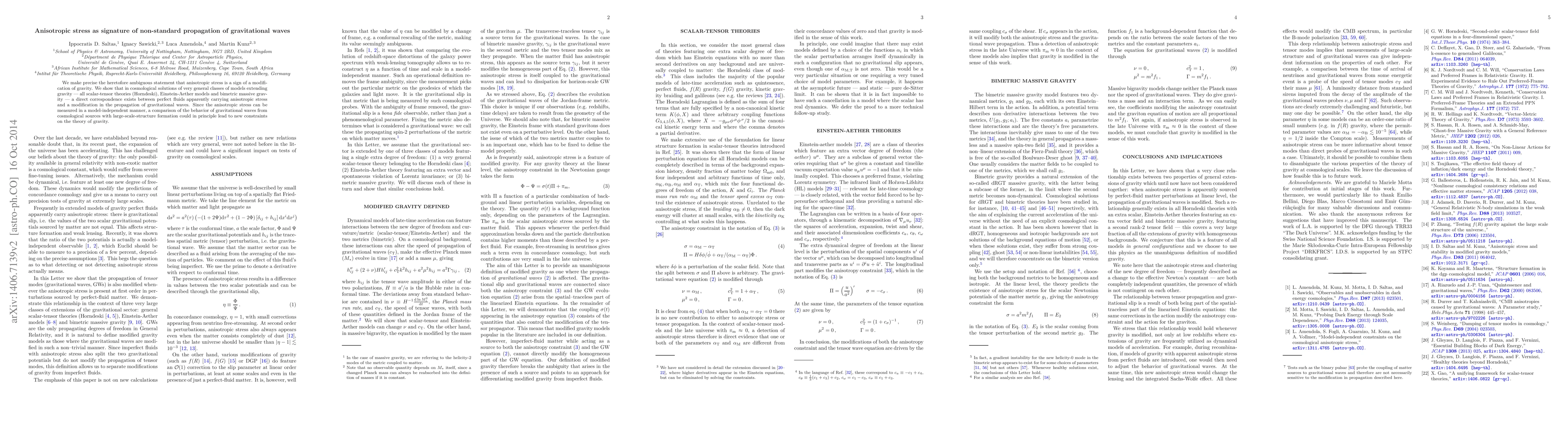 We make precise the heretofore ambiguous statement that anisotropic stress is a sign of a modification of gravity. We show that in cosmological solutions of very general classes of models extending gravity --- all scalar-tensor theories (Horndeski), Einstein-Aether models and bimetric massive gravity --- a direct correspondence exists between perfect fluids apparently carrying anisotropic stress and a modification in the propagation of gravitational waves. Since the anisotropic stress can be measured in a model-independent manner, a comparison of the behavior of gravitational waves from cosmological sources with large-scale-structure formation could in principle lead to new constraints on the theory of gravity.