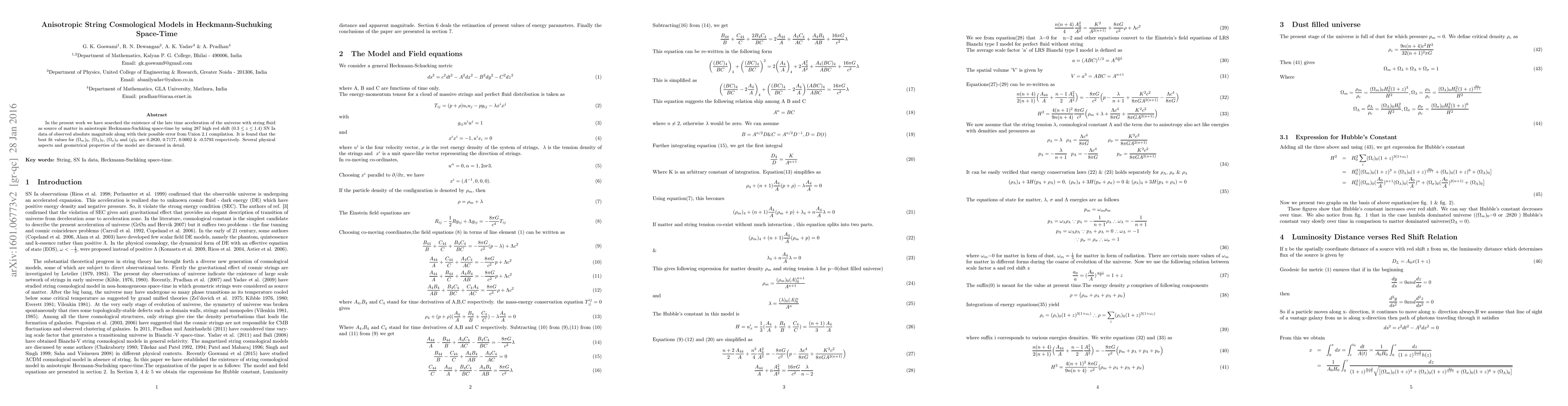 In the present work we have searched the existence of the late time acceleration of the universe with string fluid as source of matter in anisotropic Heckmann-Suchking space-time by using 287 high red shift $(0.3 \leq z\leq 1.4)$ SN Ia data of observed absolute magnitude along with their possible error from Union 2.1 compilation. It is found that the best fit values for $(\Omega_{m})_{0}$, $(\Omega_{\Lambda})_{0}$, $(\Omega_{\sigma})_{0}$ and $(q)_{0}$ are 0.2820, 0.7177, 0.0002 $\&$ -0.5793 respectively. Several physical aspects and geometrical properties of the model are discussed in detail.