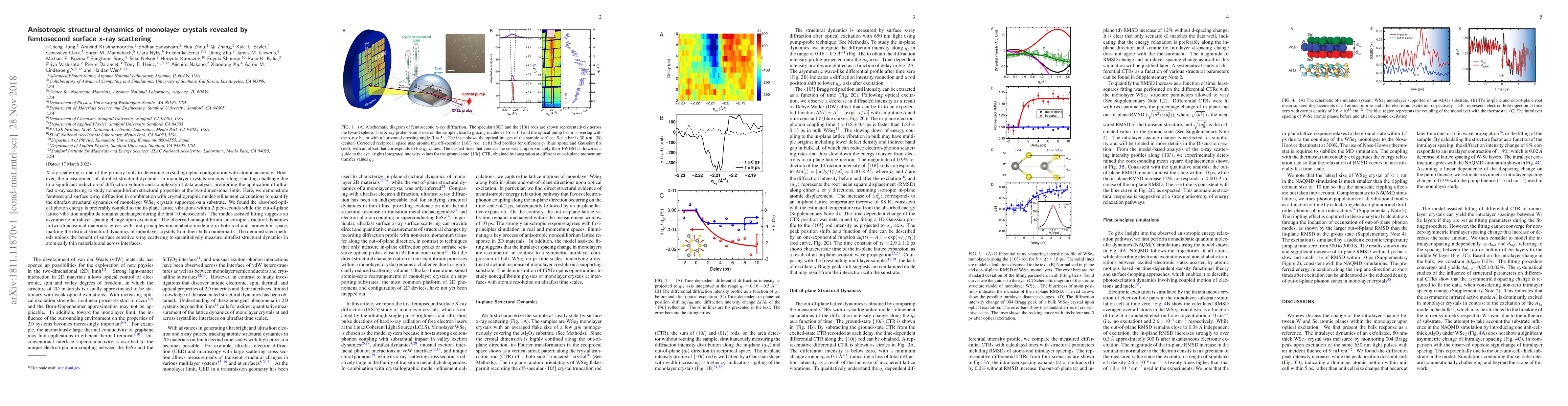 X-ray scattering is one of the primary tools to determine crystallographic configuration with atomic accuracy. However, the measurement of ultrafast structural dynamics in monolayer crystals remains a long-standing challenge due to a significant reduction of diffraction volume and complexity of data analysis, prohibiting the application of ultrafast x-ray scattering to study nonequilibrium structural properties at the two-dimensional limit. Here, we demonstrate femtosecond surface x-ray diffraction in combination with crystallographic model-refinement calculations to quantify the ultrafast structural dynamics of monolayer WSe$_2$ crystals supported on a substrate. We found the absorbed optical photon energy is preferably coupled to the in-plane lattice vibrations within 2 picoseconds while the out-of-plane lattice vibration amplitude remains unchanged during the first 10 picoseconds. The model-assisted fitting suggests an asymmetric intralayer spacing change upon excitation. The observed nonequilibrium anisotropic structural dynamics in two-dimensional materials agrees with first-principles nonadiabatic modeling in both real and momentum space, marking the distinct structural dynamics of monolayer crystals from their bulk counterparts. The demonstrated methods unlock the benefit of surface sensitive x-ray scattering to quantitatively measure ultrafast structural dynamics in atomically thin materials and across interfaces.