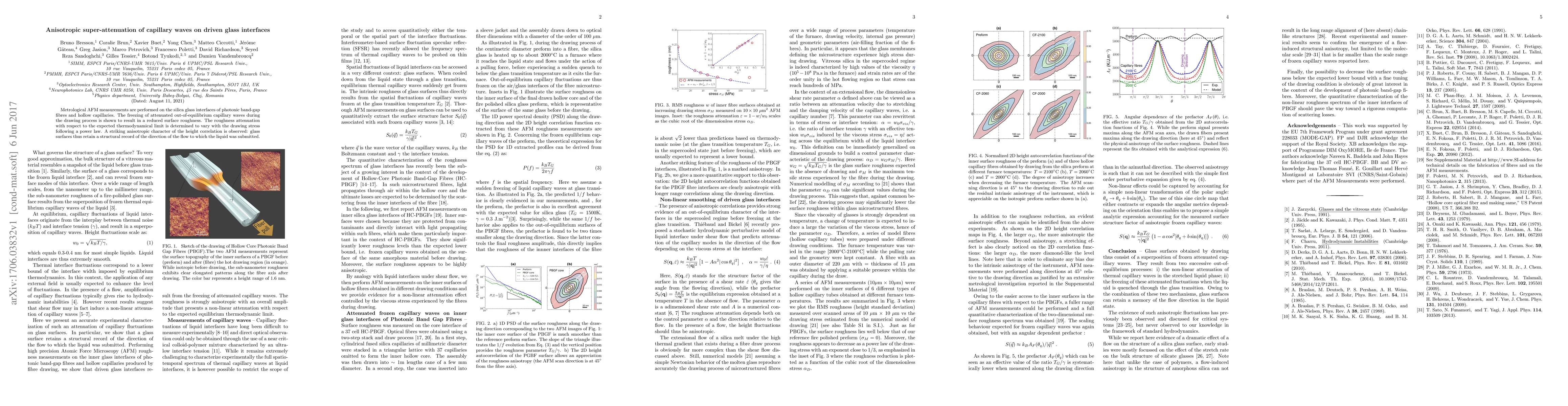 Metrological AFM measurements are performed on the silica glass interfaces of photonic band-gap fibres and hollow capillaries. The freezing of attenuated out-of-equilibrium capillary waves during the drawing process is shown to result in a reduced surface roughness. The roughness attenuation with respect to the expected thermodynamical limit is determined to vary with the drawing stress following a power law. A striking anisotropic character of the height correlation is observed: glass surfaces thus retain a structural record of the direction of the flow to which the liquid was submitted.