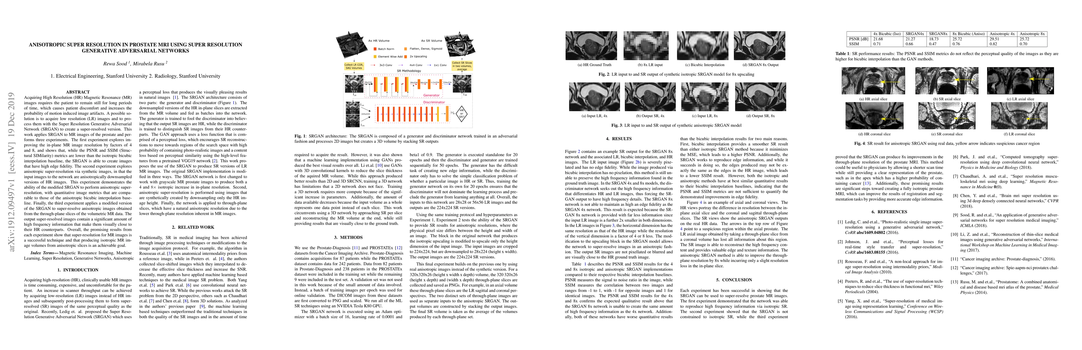Acquiring High Resolution (HR) Magnetic Resonance (MR) images requires the patient to remain still for long periods of time, which causes patient discomfort and increases the probability of motion induced image artifacts. A possible solution is to acquire low resolution (LR) images and to process them with the Super Resolution Generative Adversarial Network (SRGAN) to create a super-resolved version. This work applies SRGAN to MR images of the prostate and performs three experiments. The first experiment explores improving the in-plane MR image resolution by factors of 4 and 8, and shows that, while the PSNR and SSIM (Structural SIMilarity) metrics are lower than the isotropic bicubic interpolation baseline, the SRGAN is able to create images that have high edge fidelity. The second experiment explores anisotropic super-resolution via synthetic images, in that the input images to the network are anisotropically downsampled versions of HR images. This experiment demonstrates the ability of the modified SRGAN to perform anisotropic super-resolution, with quantitative image metrics that are comparable to those of the anisotropic bicubic interpolation baseline. Finally, the third experiment applies a modified version of the SRGAN to super-resolve anisotropic images obtained from the through-plane slices of the volumetric MR data. The output super-resolved images contain a significant amount of high frequency information that make them visually close to their HR counterparts. Overall, the promising results from each experiment show that super-resolution for MR images is a successful technique and that producing isotropic MR image volumes from anisotropic slices is an achievable goal.