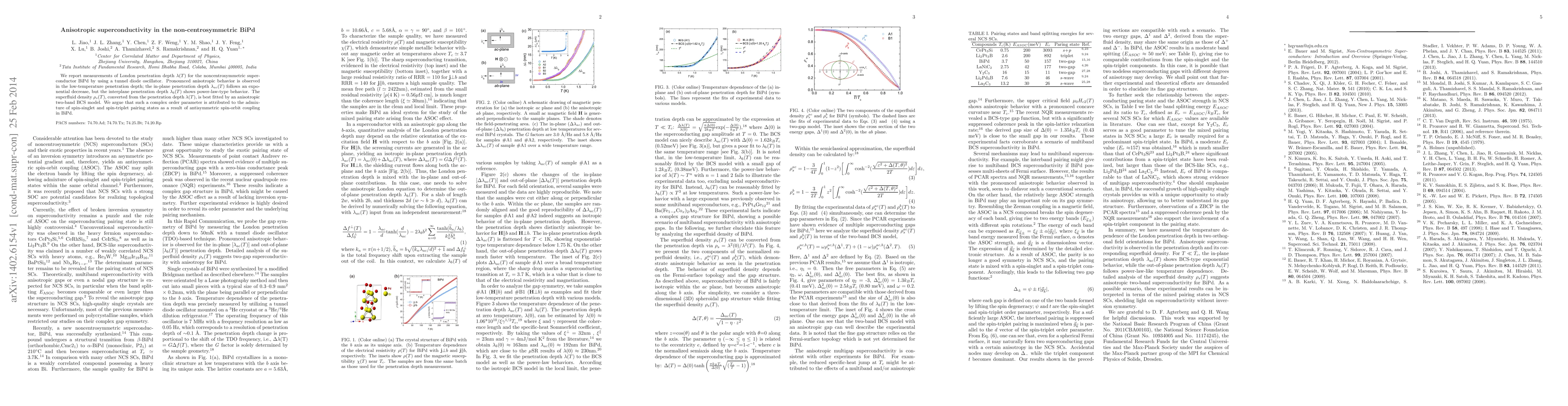 This study investigates the anisotropic superconductivity in BiPd using tunnel diode oscillator measurements, revealing distinct in-plane and interplane penetration depth behaviors. The findings suggest an anisotropic two-band BCS model, indicating a complex order parameter likely due to spin-singlet and spin-triplet pairing states from antisymmetric spin-orbit coupling.