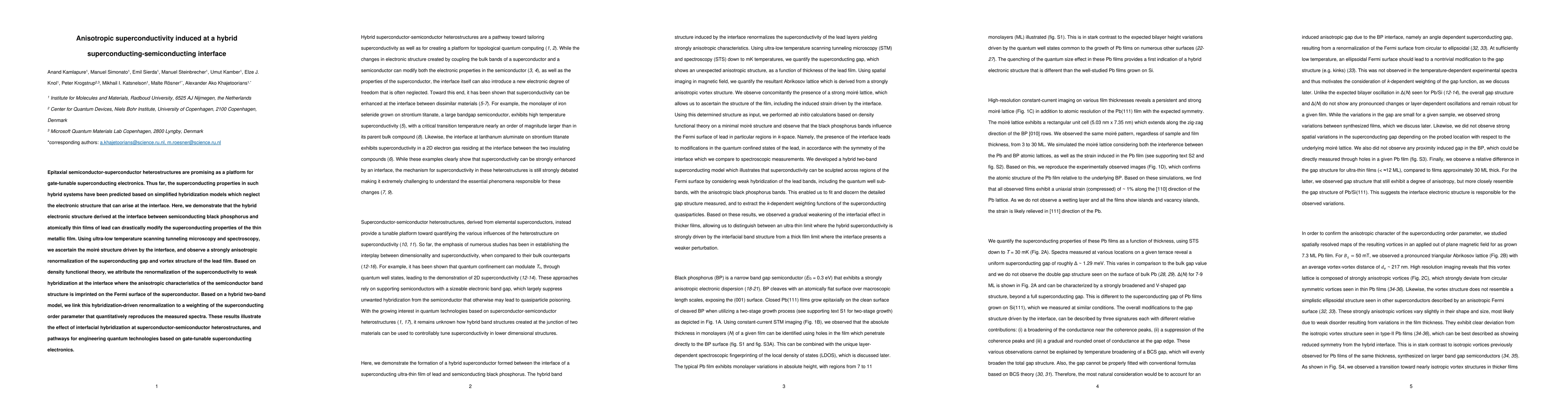 This paper demonstrates that the interface between semiconducting black phosphorus and lead films induces anisotropic superconductivity, modifying the superconducting properties through weak hybridization. The study uses scanning tunneling microscopy to reveal the moiré structure and anisotropic superconducting gap renormalization, linking these effects to the semiconductor's band structure.