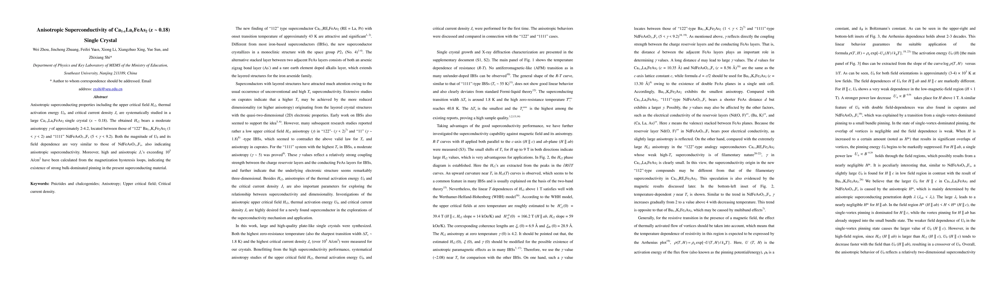 This study investigates the anisotropic superconducting properties of Ca1-xLaxFeAs2 (x ~ 0.18) single crystals, revealing moderate anisotropy in the upper critical field Hc2 and high critical current density Jc, indicative of strong bulk-dominated pinning. The thermal activation energy U0 and its field dependence align closely with those of NdFeAsO1-xFx, further supporting the anisotropic superconductivity.