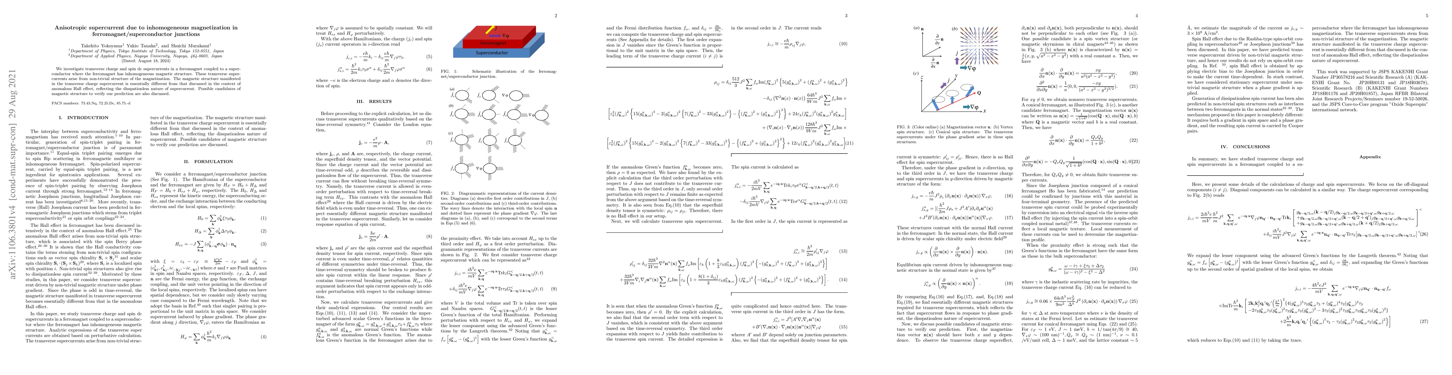 We investigate transverse charge and spin dc supercurrents in a ferromagnet coupled to a superconductor where the ferromagnet has inhomogeneous magnetic structure. These transverse supercurrents arise from non-trivial structure of the magnetization. The magnetic structure manifested in the transverse charge supercurrent is essentially different from that discussed in the context of anomalous Hall effect, reflecting the disspationless nature of supercurrent. Possible candidates of magnetic structure to verify our prediction are also discussed.