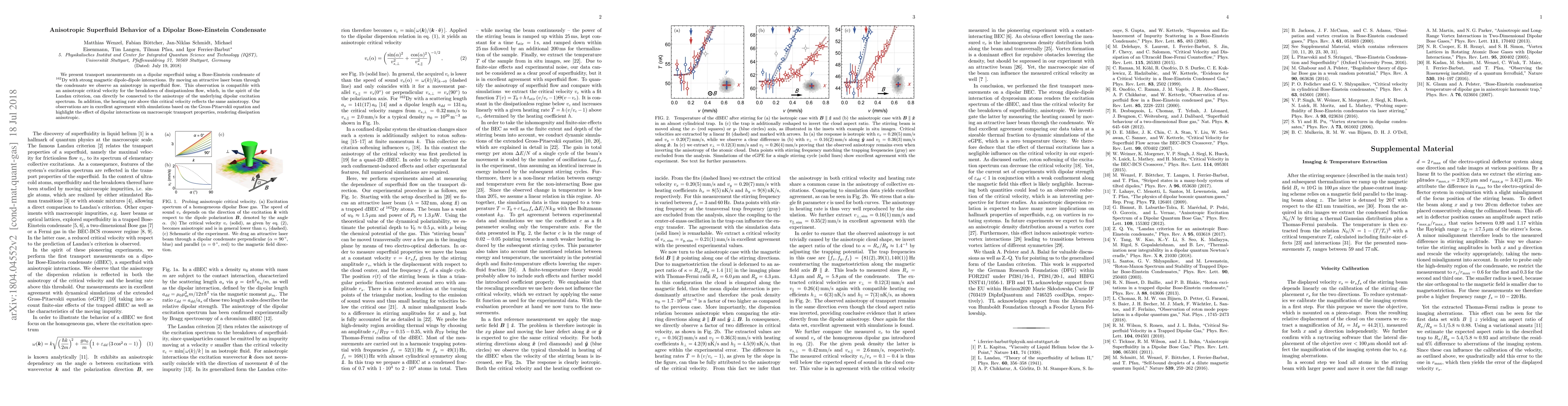 This study investigates anisotropic superfluid behavior in a dipolar Bose-Einstein condensate of Dy-162, revealing an anisotropic critical velocity for dissipationless flow breakdown. The observed anisotropy aligns with the dipolar excitation spectrum and is corroborated by Gross-Pitaevskii equation simulations.