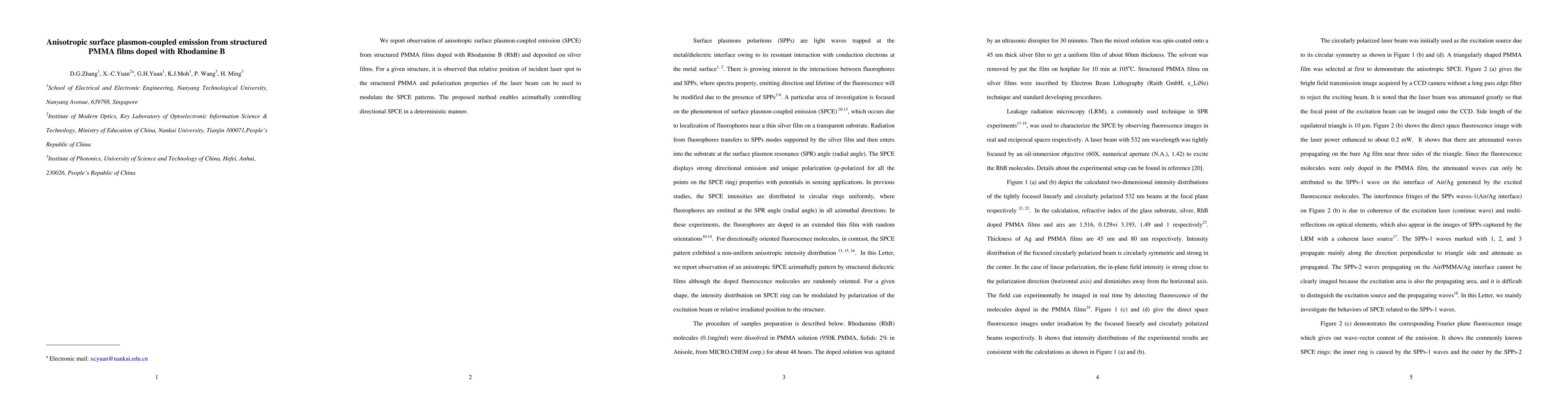 This study observes anisotropic surface plasmon-coupled emission (SPCE) from structured PMMA films doped with Rhodamine B on silver films, showing that SPCE patterns can be modulated by the relative position of the laser spot and the polarization properties of the laser beam, enabling deterministic control over the emission direction.