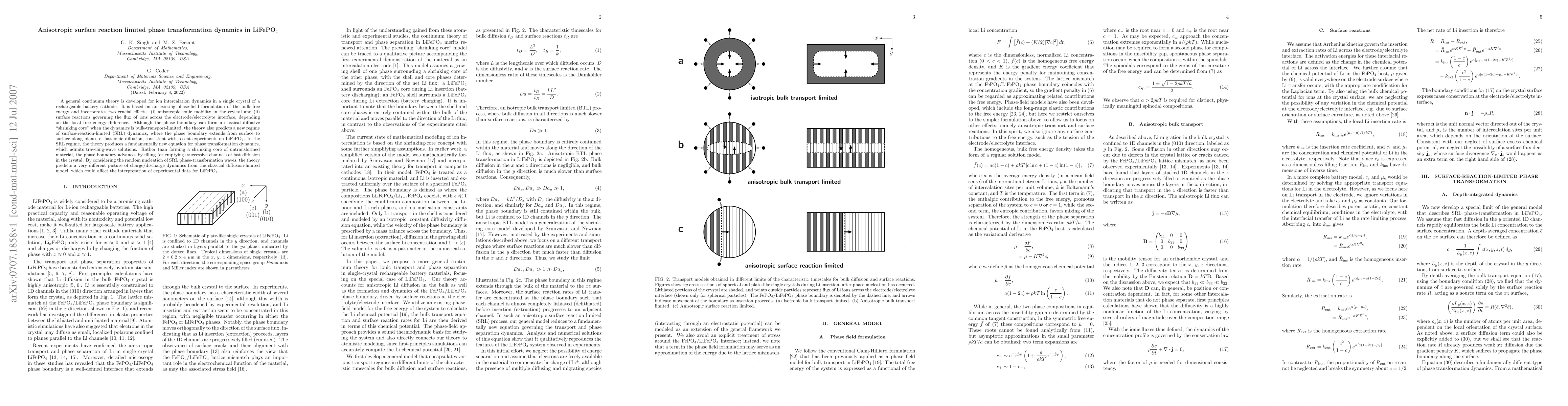 This paper develops a continuum theory for ion intercalation in LiFePO4 crystals, focusing on anisotropic ionic mobility and surface reactions. It introduces a new surface-reaction-limited phase transformation regime, predicting a different charge/discharge dynamics model compared to classical diffusion-limited approaches.