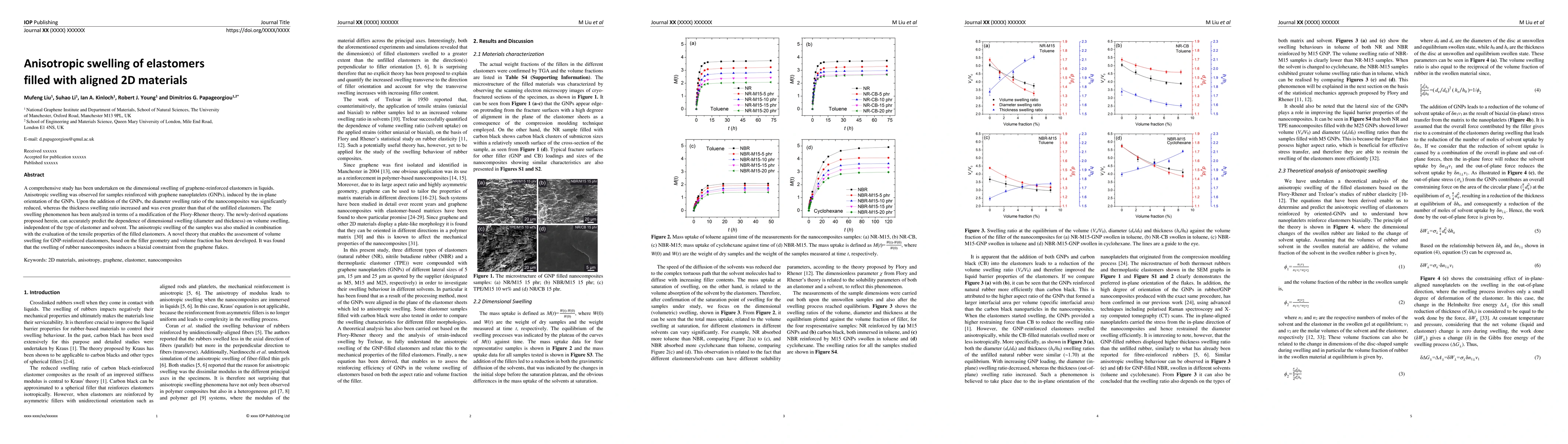 This study investigates the anisotropic swelling behavior of graphene-reinforced elastomers in liquid environments, revealing significant diameter reduction and thickness increase due to the in-plane orientation of graphene nanoplatelets. A novel theory is proposed to predict the dimensional swelling based on filler geometry and volume fraction, highlighting the biaxial constraint induced by graphene flakes.