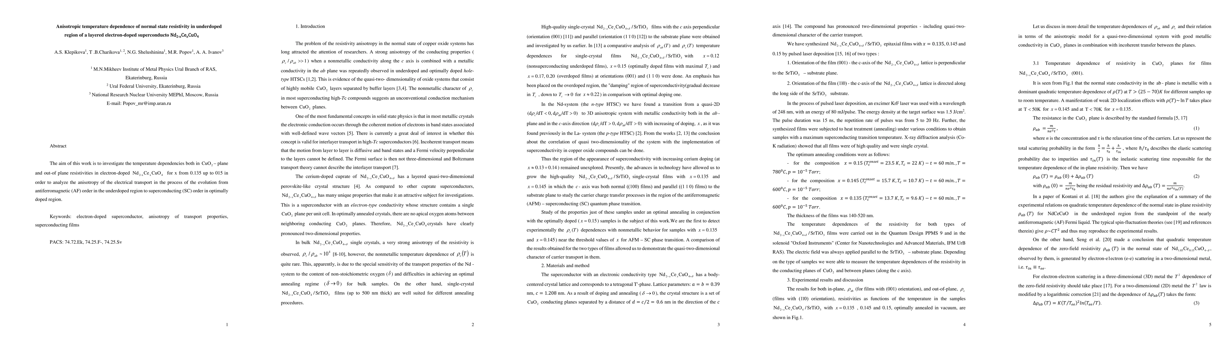 The aim of this work is to investigate the temperature dependencies both in CuO2-plane and out-of plane resistivities in electron-doped Nd2-xCexCuO4 for x from 0.135 up to 0.15 in order to analyze the anisotropy of the electrical transport in the process of the evolution from antiferromagnetic (AF) order in underdoped region to superconducting (SC) order in optimally doped region.