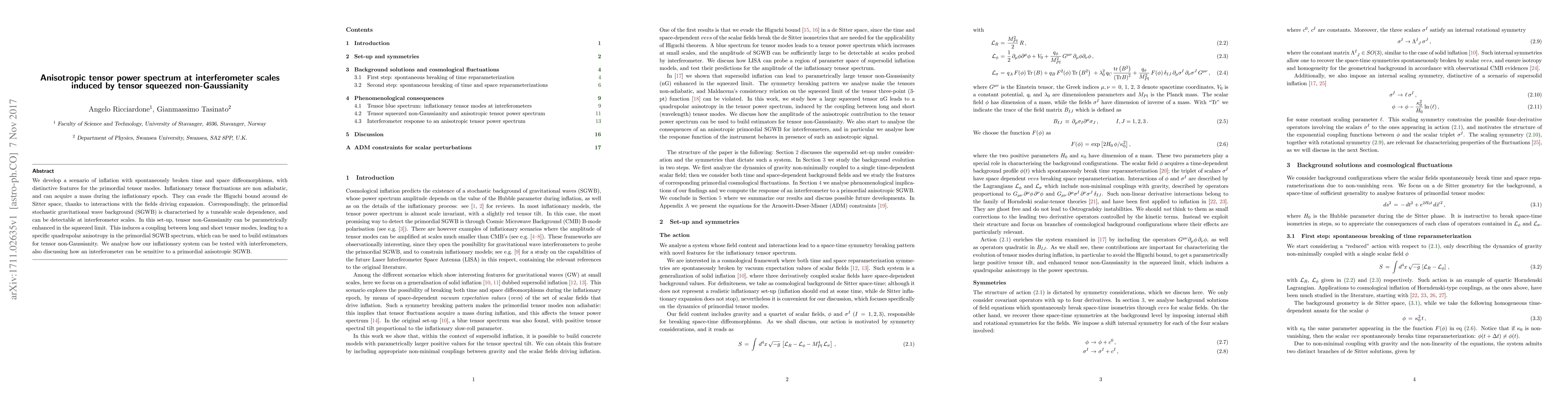This paper explores an inflationary model where tensor modes acquire mass and evade the Higuchi bound, leading to a detectable anisotropic tensor power spectrum at interferometer scales. The model induces tensor squeezed non-Gaussianity, enhancing the coupling between long and short tensor modes and providing a unique quadrupolar anisotropy in the primordial gravitational wave background.