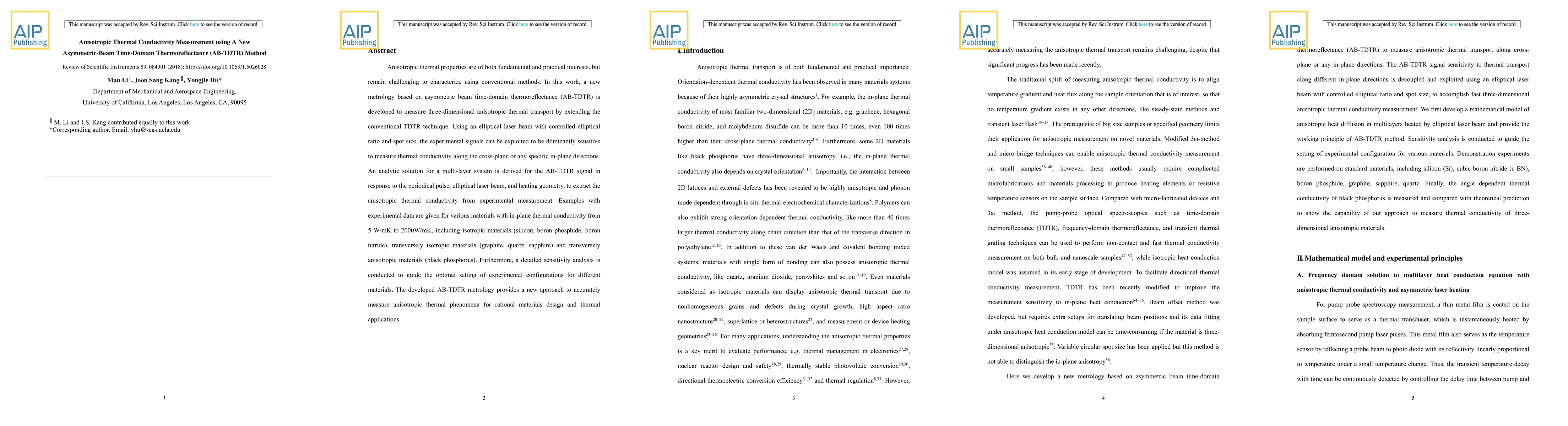 This paper develops a new AB-TDTR method to measure three-dimensional anisotropic thermal transport using an elliptical laser beam. The method provides accurate measurements of thermal conductivity in various materials, including isotropic, transversely isotropic, and transversely anisotropic materials.