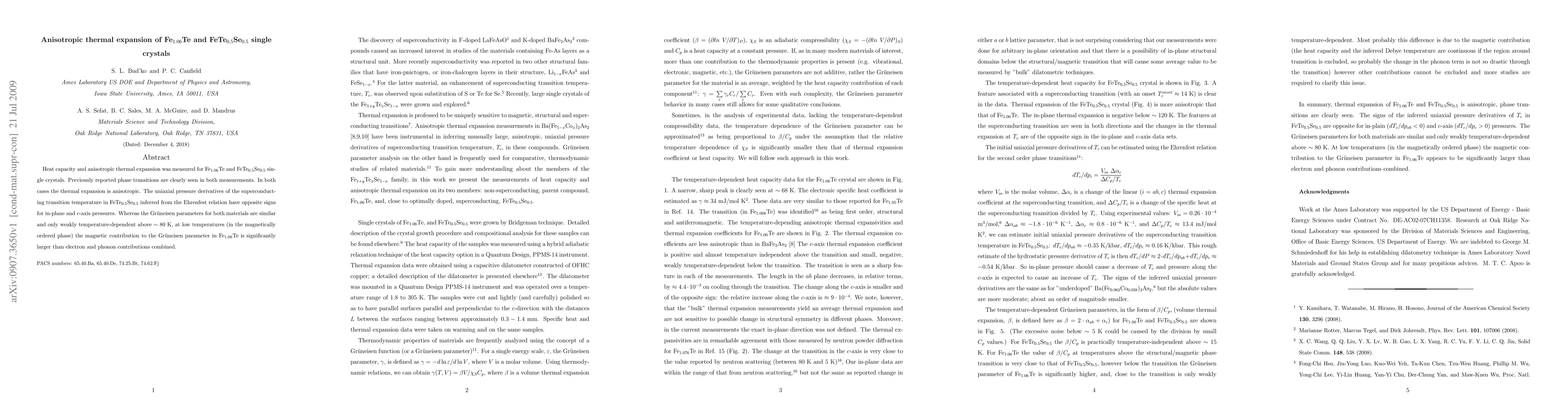 Researchers studied the thermal expansion of two iron chalcogenide single crystals, Fe1.06Te and FeTe0.5Se0.5, finding anisotropic effects and differing responses to pressure and temperature changes.