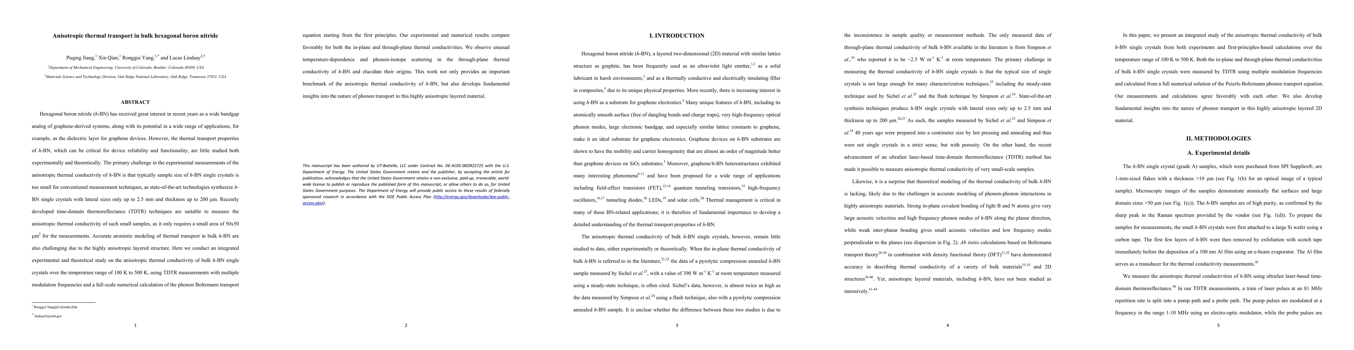 This study combines experimental time-domain thermoreflectance (TDTR) measurements and theoretical phonon transport modeling to investigate the anisotropic thermal conductivity of bulk hexagonal boron nitride (h-BN) from 100 K to 500 K. The research reveals unusual temperature-dependent behavior and phonon-isotope scattering in the through-plane thermal conductivity, offering fundamental insights into phonon transport in this layered material.