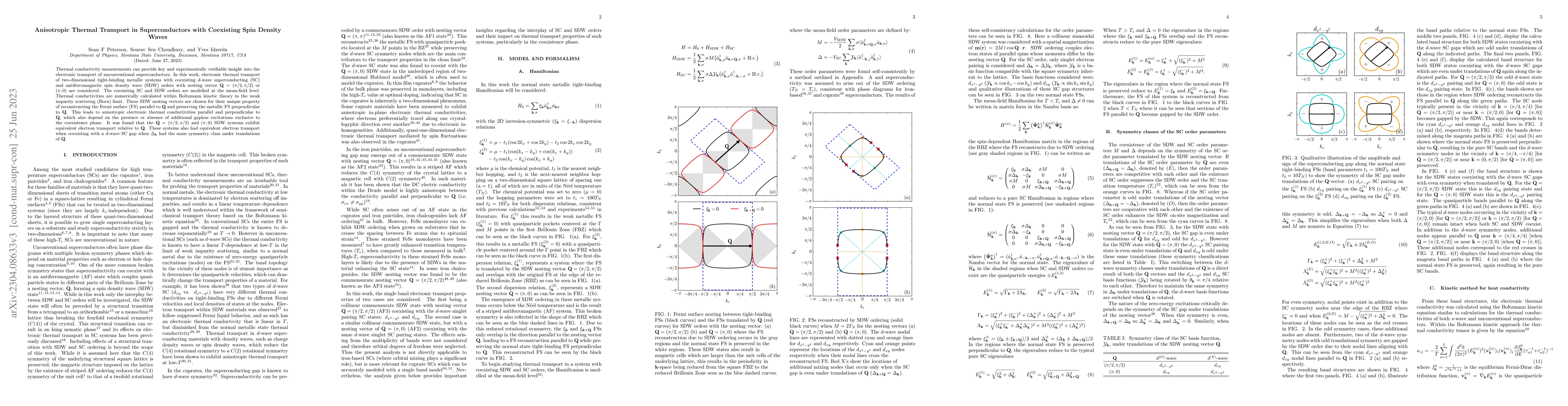 This study investigates the anisotropic thermal transport in two-dimensional metallic systems where $d$-wave superconductivity and spin density wave orders coexist, leading to reconstructed Fermi surfaces. The research finds that the thermal conductivities exhibit anisotropy depending on the nesting vector, with equivalent transport properties for specific symmetry classes.