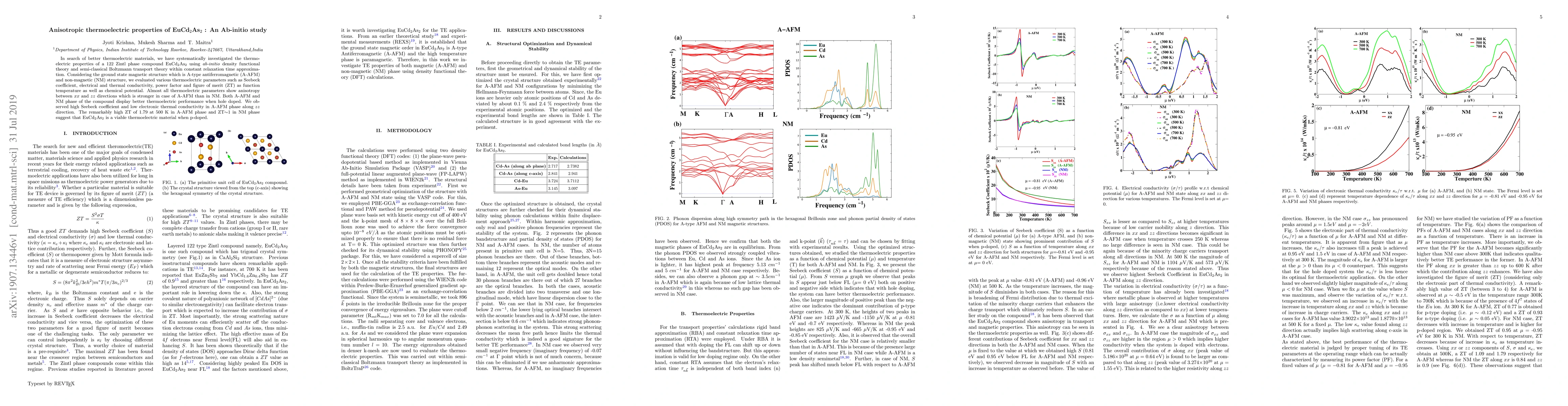 This research utilizes \textit{ab-initio} methods to study the thermoelectric properties of EuCd$_{2}$As$_{2}$, finding anisotropic behavior and superior thermoelectric performance in its A-type antiferromagnetic phase, especially upon hole doping, with a high ZT of 1.79 at 500 K.
