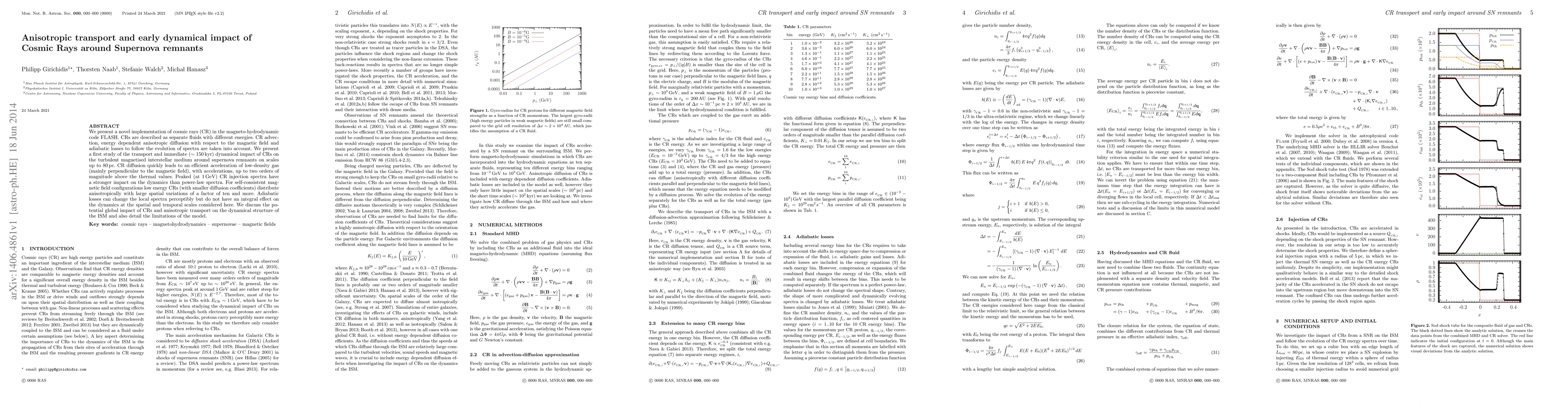 We present a novel implementation of cosmic rays (CR) in the magneto-hydrodynamic code FLASH. CRs are described as separate fluids with different energies. CR advection, energy dependent anisotropic diffusion with respect to the magnetic field and adiabatic losses to follow the evolution of spectra are taken into account. We present a first study of the transport and immediate (~150 kyr) dynamical impact of CRs on the turbulent magnetised interstellar medium around supernova remnants on scales up to 80 pc. CR diffusion quickly leads to an efficient acceleration of low-density gas (mainly perpendicular to the magnetic field) with accelerations up to two orders of magnitude above the thermal values. Peaked (at 1 GeV) CR injection spectra have a stronger impact on the dynamics than power-law spectra. For realistic magnetic field configurations low energy CRs (with smaller diffusion coefficients) distribute anisotropically with large spatial variations of a factor of ten and more. Adiabatic losses can change the local spectra perceptibly but do not have an integral effect on the dynamics at the spatial and temporal scales considered here. We discuss the potential global impact of CRs and anisotropic transport on the dynamical structure of the ISM and also detail the limitations of the model.