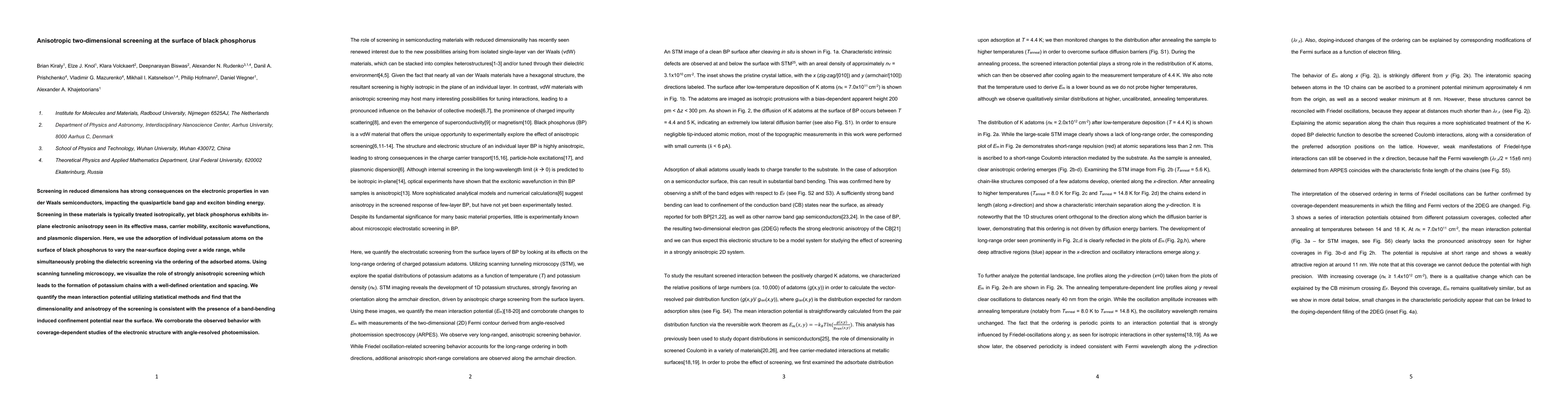 This paper investigates anisotropic two-dimensional screening at the surface of black phosphorus, showing that potassium adsorption creates strongly anisotropic effects impacting electronic properties. Scanning tunneling microscopy reveals potassium chain formation due to anisotropic screening, confirmed by angle-resolved photoemission studies.