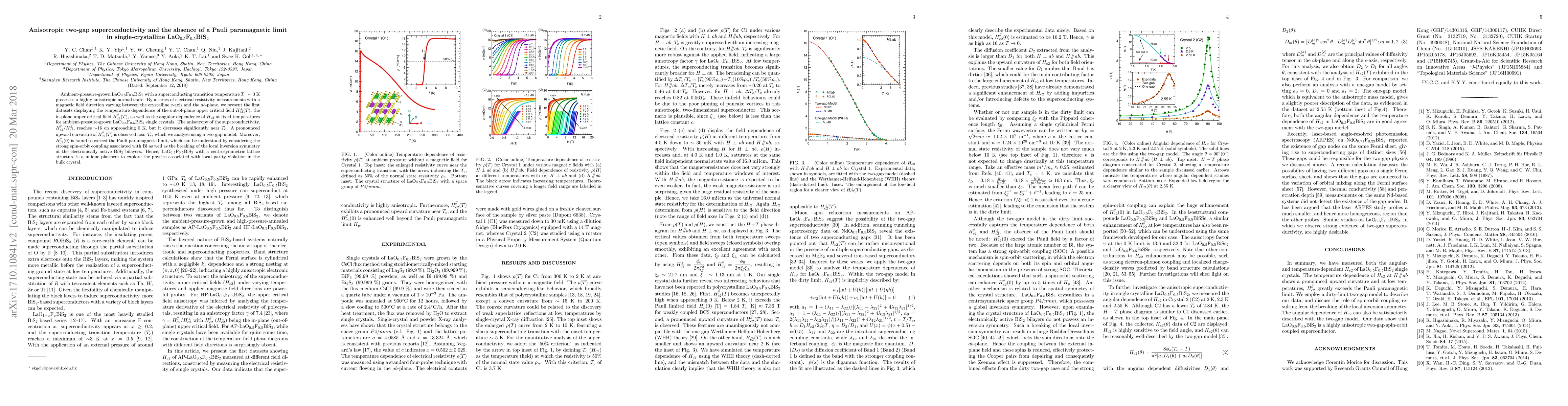 This study reveals anisotropic two-gap superconductivity in LaO$_{0.5}$F$_{0.5}$BiS$_2$, where the upper critical field anisotropy reaches about 16 near 0 K, and finds that the in-plane upper critical field exceeds the Pauli paramagnetic limit, indicating the influence of spin-orbit coupling and broken inversion symmetry.