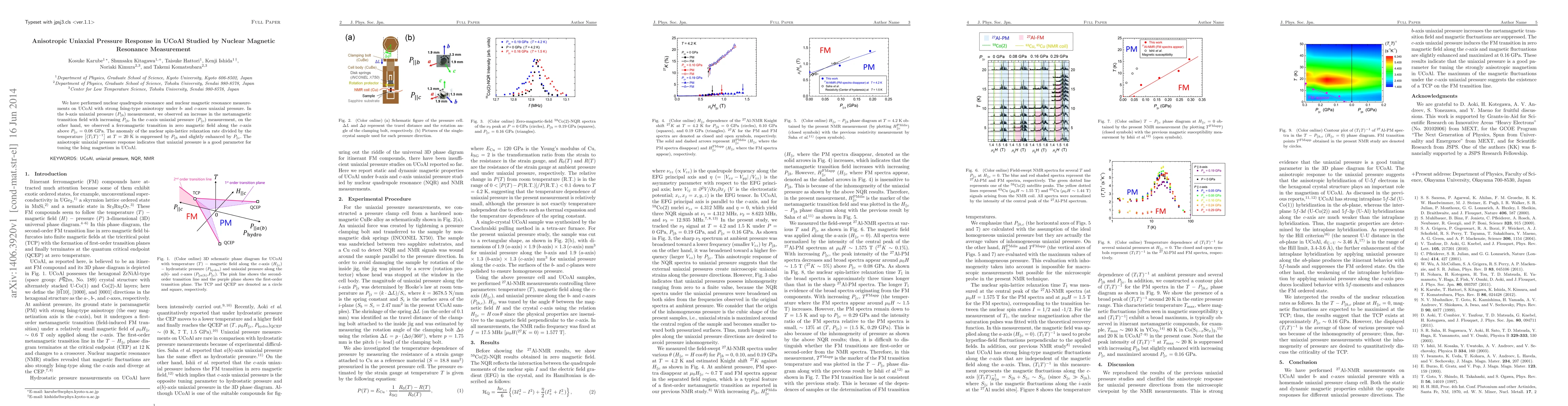 This study investigates the anisotropic uniaxial pressure response in UCoAl using nuclear magnetic resonance, revealing that $b$-axis pressure increases the metamagnetic transition field while $c$-axis pressure induces a ferromagnetic transition above 0.08 GPa. The pressure-induced changes in nuclear spin-lattice relaxation suggest that uniaxial pressure can effectively tune Ising magnetism in UCoAl.