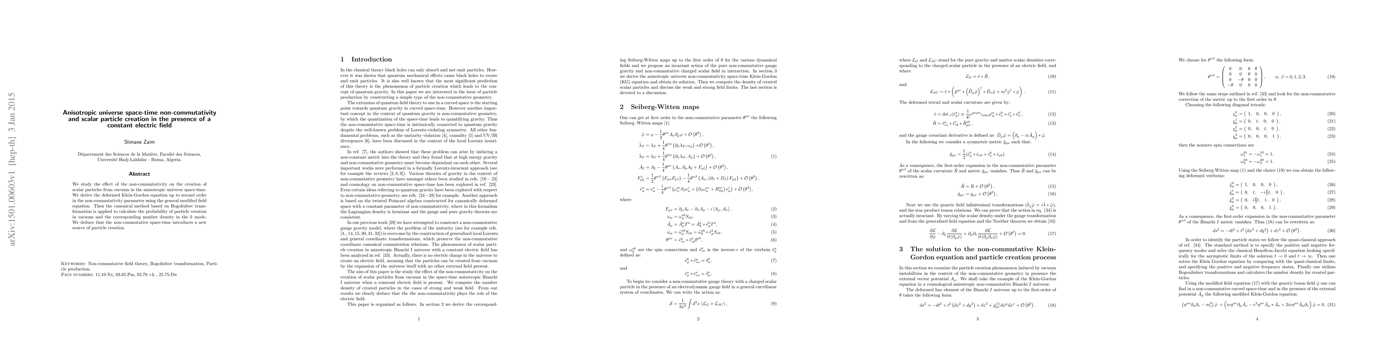 This paper investigates the impact of non-commutativity on scalar particle creation in anisotropic universe space-time, deriving a deformed Klein-Gordon equation and using Bogoliubov transformation to find that non-commutative space-time generates a new source of particle creation in the presence of a constant electric field.