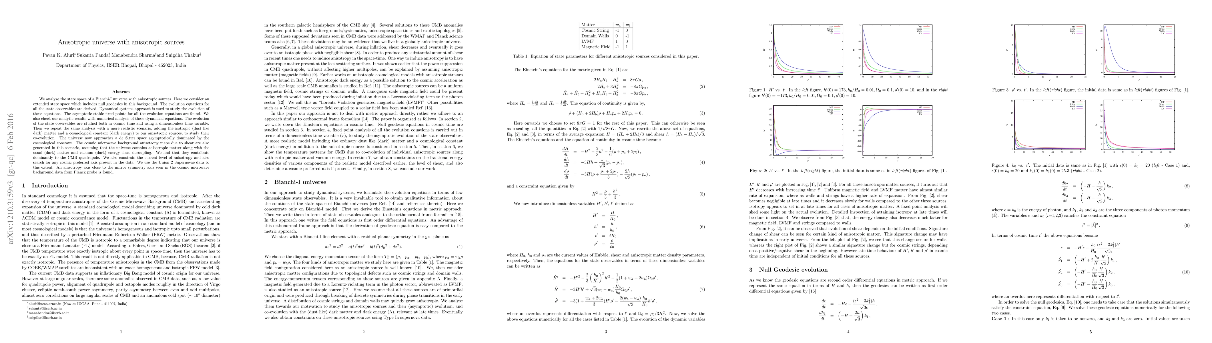 We analyze the state space of a Bianchi-I universe with anisotropic sources. Here we consider an extended state space which includes null geodesics in this background. The evolution equations for all the state observables are derived. Dynamical systems approach is used to study the evolution of these equations. The asymptotic stable fixed points for all the evolution equations are found. We also check our analytic results with numerical analysis of these dynamical equations. The evolution of the state observables are studied both in cosmic time and using a dimensionless time variable. Then we repeat the same analysis with a more realistic scenario, adding the isotropic (dust like dark) matter and a cosmological constant (dark energy) to our anisotropic sources, to study their co-evolution. The universe now approaches a de~Sitter space asymptotically dominated by the cosmological constant. The cosmic microwave background anisotropy maps due to shear are also generated in this scenario, assuming that the universe contains anisotropic matter along with the usual (dark) matter and vacuum (dark) energy since decoupling. We find that they contribute dominantly to the CMB quadrupole. We also constrain the current level of anisotropy and also search for any cosmic preferred axis present in the data. We use the Union~2 Supernovae data to this extent. An anisotropy axis close to the mirror symmetry axis seen in the cosmic microwave background data from Planck probe is found.