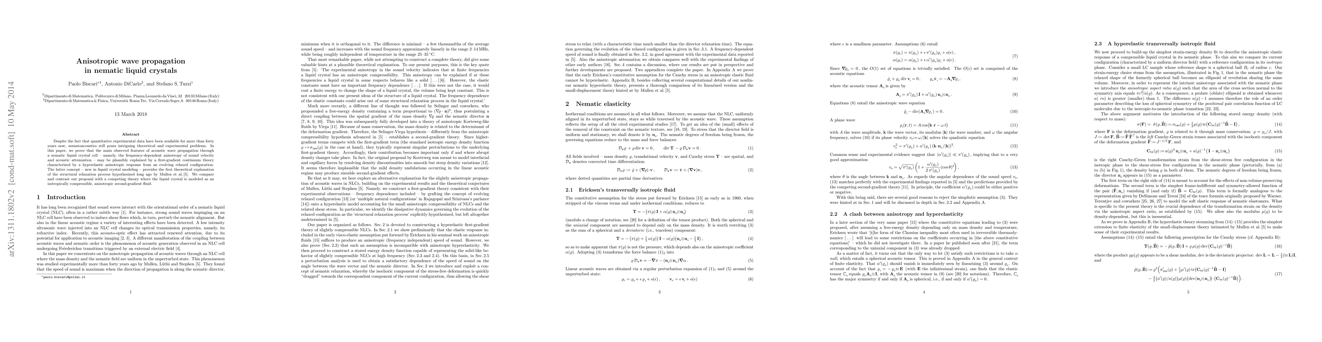 The paper presents a first-gradient continuum theory to explain the anisotropy of sound velocity and its frequency dependence in nematic liquid crystals, contrasting it with a competing second-gradient fluid theory.