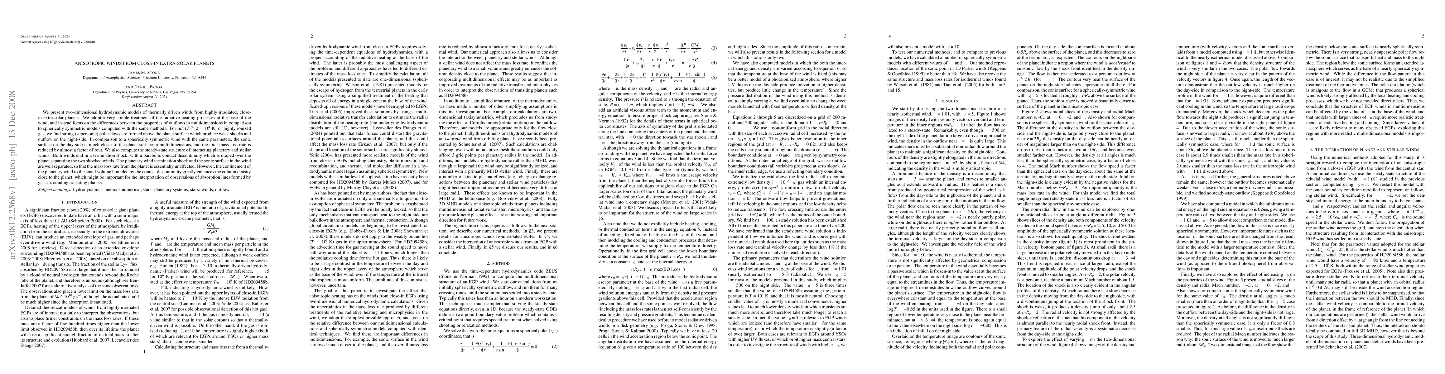 Researchers model thermally driven winds from close-in extra-solar planets, finding polar flows with weak shocks on the night-side and reduced mass loss rates compared to spherically symmetric models.
