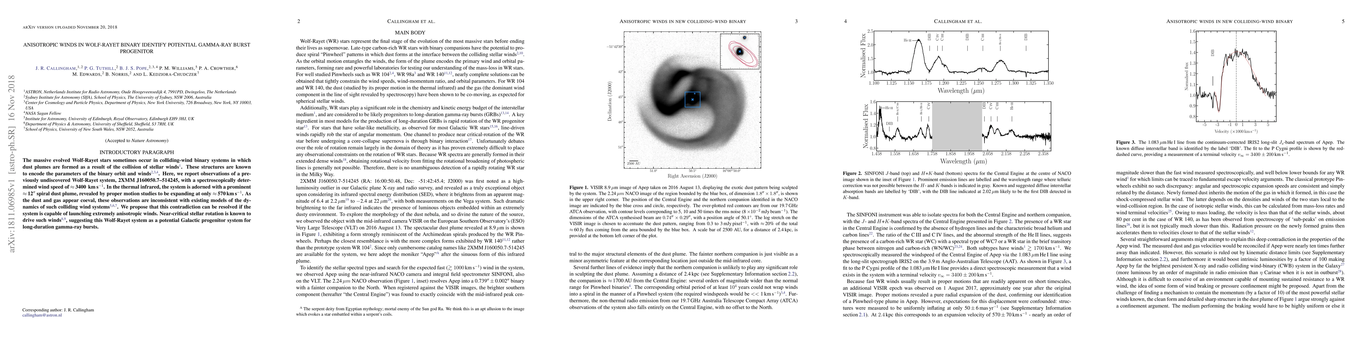 This paper identifies a Wolf-Rayet binary system, 2XMM J160050.7-514245, with highly anisotropic winds, suggesting it may be a progenitor for long-duration gamma-ray bursts due to its near-critical stellar rotation. The system's dust plume contradicts existing models, hinting at unique wind dynamics.