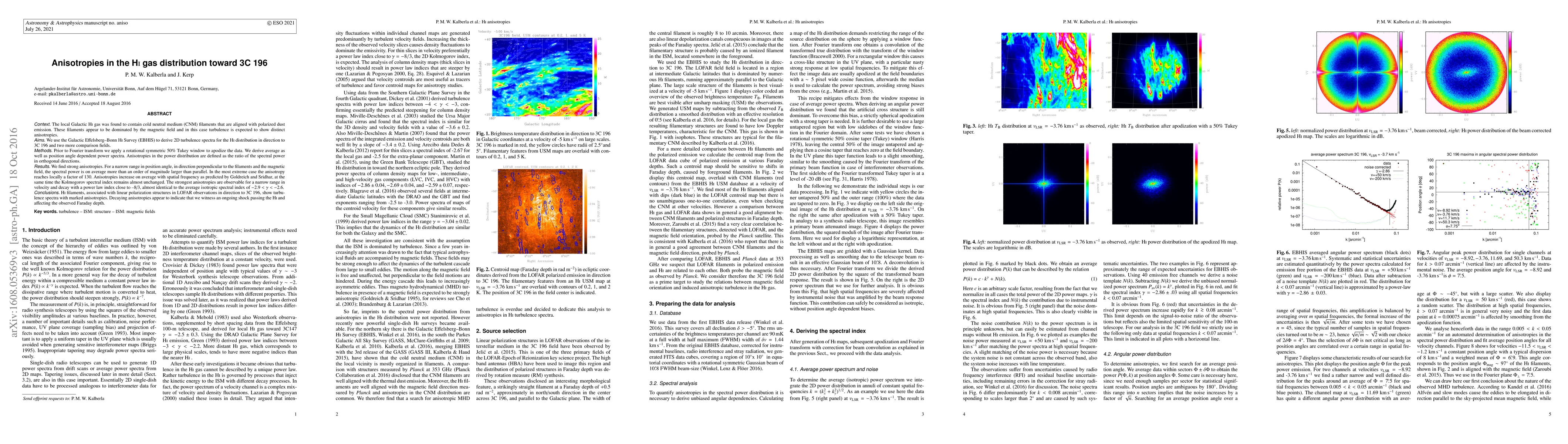 The local Galactic HI gas was found to contain cold neutral medium (CNM) filaments that are aligned with polarized dust emission. These filaments appear to be dominated by the magnetic field and in this case turbulence is expected to show distinct anisotropies. We use the Galactic Effelsberg--Bonn HI Survey (EBHIS) to derive 2D turbulence spectra for the HI distribution in direction to 3C196 and two more comparison fields. Prior to Fourier transform we apply a rotational symmetric 50% Tukey window to apodize the data. We derive average as well as position angle dependent power spectra. Anisotropies in the power distribution are defined as the ratio of the spectral power in orthogonal directions. We find strong anisotropies. For a narrow range in position angle, in direction perpendicular to the filaments and the magnetic field, the spectral power is on average more than an order of magnitude larger than parallel. In the most extreme case the anisotropy reaches locally a factor of 130. Anisotropies increase on average with spatial frequency as predicted by Goldreich and Sridhar, at the same time the Kolmogorov spectral index remains almost unchanged. The strongest anisotropies are observable for a narrow range in velocity and decay with a power law index close to --8/3, almost identical to the average isotropic spectral index of $-2.9 < \gamma < -2.6$. HI filaments, associated with linear polarization structures in LOFAR observations in direction to 3C196, show turbulence spectra with marked anisotropies. Decaying anisotropies appear to indicate that we witness an ongoing shock passing the HI and affecting the observed Faraday depth.
