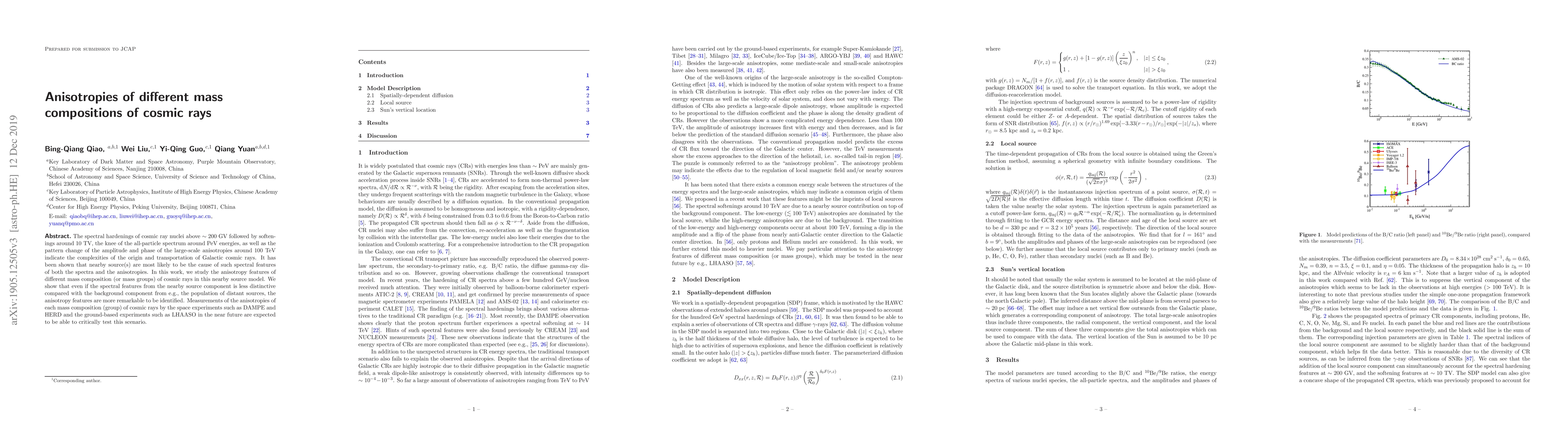 This paper investigates the anisotropy features of cosmic rays with different mass compositions, revealing that nearby sources likely cause spectral hardenings and softenings. Future space and ground-based experiments are expected to critically test this model by measuring the anisotropies of various mass groups.