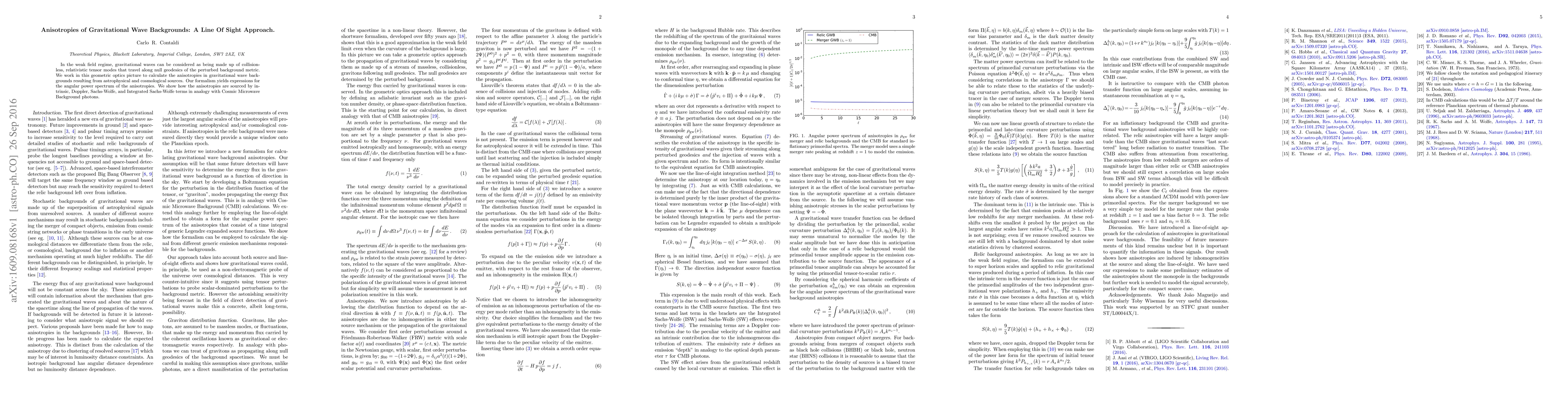 This paper investigates gravitational wave anisotropies in the weak field regime, employing geometric optics to derive expressions for the angular power spectrum. The study identifies sources of anisotropies including intrinsic, Doppler, Sachs-Wolfe, and Integrated Sachs-Wolfe effects, analogous to those in the Cosmic Microwave Background.