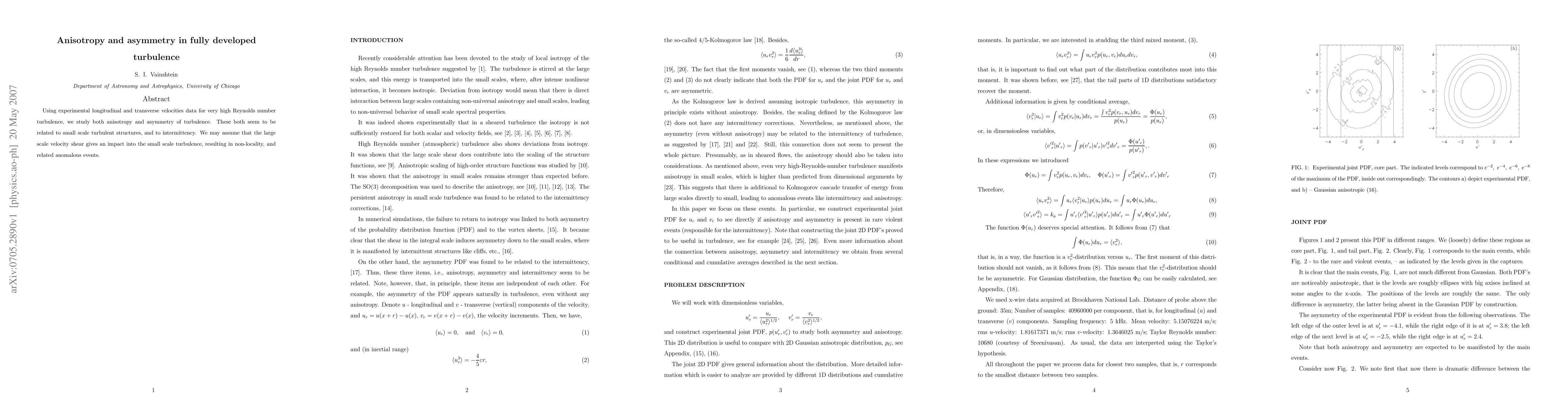 Summary: This study investigates the anisotropy and asymmetry in high Reynolds number turbulence through experimental velocity data, revealing their connection to small-scale turbulent structures and intermittency, while suggesting that large-scale velocity shear influences small-scale turbulence, leading to non-locality and anomalous events.