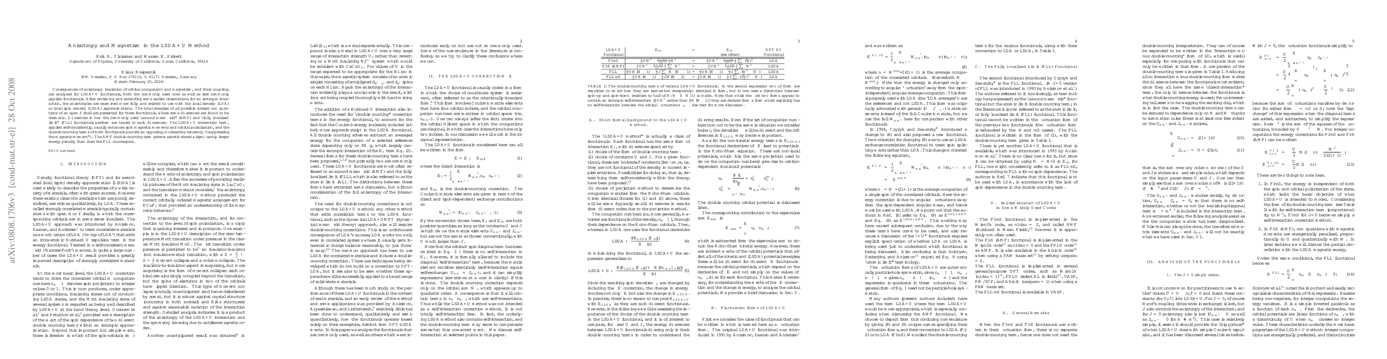 This paper investigates the effects of anisotropy and magnetism in LSDA+U functionals, highlighting significant differences between commonly used and less common variants. The study reveals that the LSDA+U method enhances spin magnetic moments but also introduces a moderating double-counting term, with the "around mean field" functional imposing a larger energy penalty on magnetic states compared to the "fully localized limit" functional.