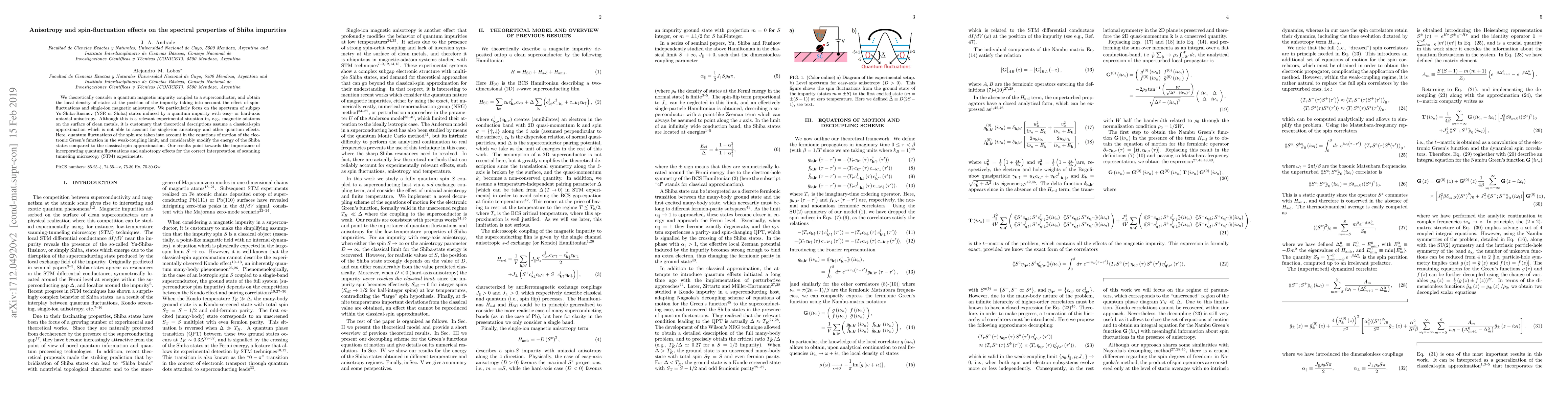This paper investigates the spectral properties of Shiba impurities in superconductors, considering the effects of spin-fluctuations and single-ion magnetic anisotropy. Quantum fluctuations significantly alter the energy of Shiba states compared to classical-spin approximations, highlighting the need for such considerations in interpreting STM experiments.