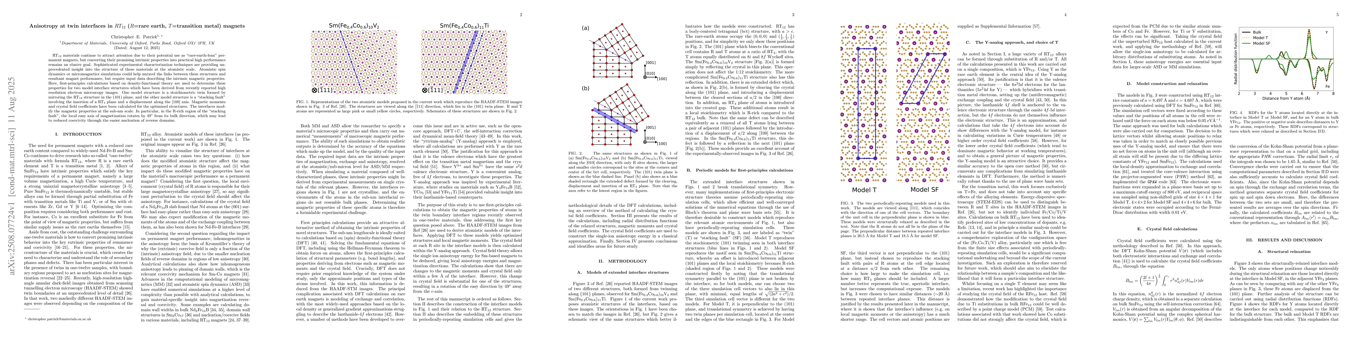 RT\textsubscript{12} materials continue to attract attention due to their potential use as ``rare-earth-lean'' permanent magnets, but converting their promising intrinsic properties into practical high performance remains an elusive goal. Sophisticated experimental characterization techniques are providing unprecedented insight into the structure of these materials at the atomistic scale. Atomistic spin dynamics or micromagnetics simulations could help unravel the links between these structures and resultant magnet performance, but require input data describing the intrinsic magnetic properties. Here, first-principles calculations based on density-functional theory are used to determine these properties for two model interface structures which have been derived from recently reported high resolution electron microscopy images. One model structure is a stoichiometric twin formed by mirroring the RT\textsubscript{12} structure in the (101) plane, and the other model structure is a ``stacking fault'' involving the insertion of a RT\textsubscript{4} plane and a displacement along the [100] axis. Magnetic moments and crystal field coefficients have been calculated for the optimized structures. The interfaces modify the magnetic properties at the sub-nm scale. In particular, in the R-rich region of the ``stacking fault'', the local easy axis of magnetization rotates by $49^\circ$ from its bulk direction, which may lead to reduced coercivity through the easier nucleation of reverse domains.
