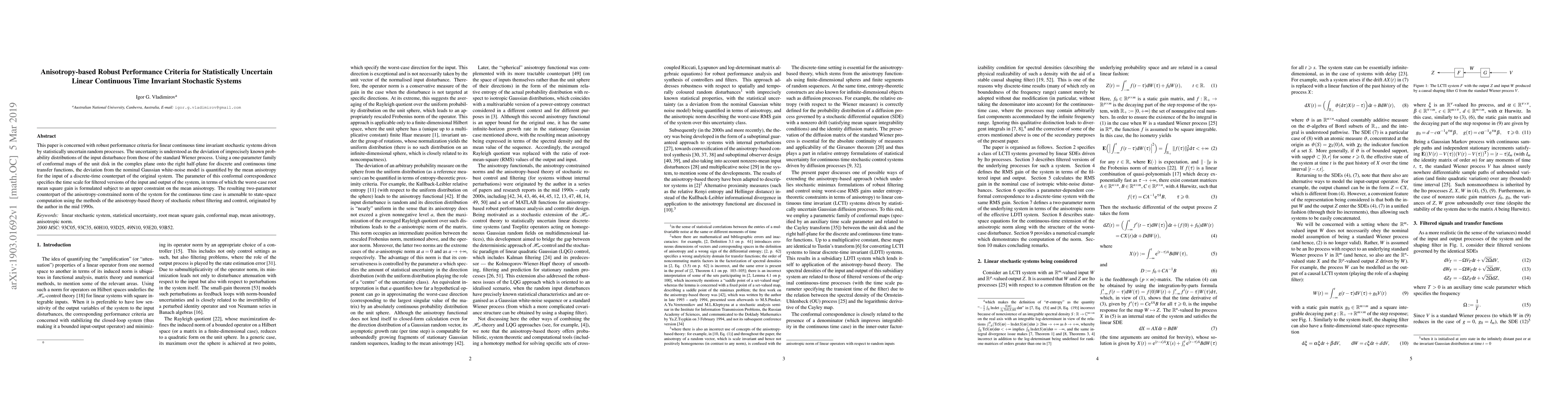 This paper develops robust performance criteria for linear stochastic systems with statistically uncertain random inputs, quantifying deviation from standard Gaussian models using mean anisotropy and conformal mappings. The worst-case root mean square gain is formulated under an upper mean anisotropy constraint, enabling state-space computation via the author's anisotropy-based stochastic control theory.